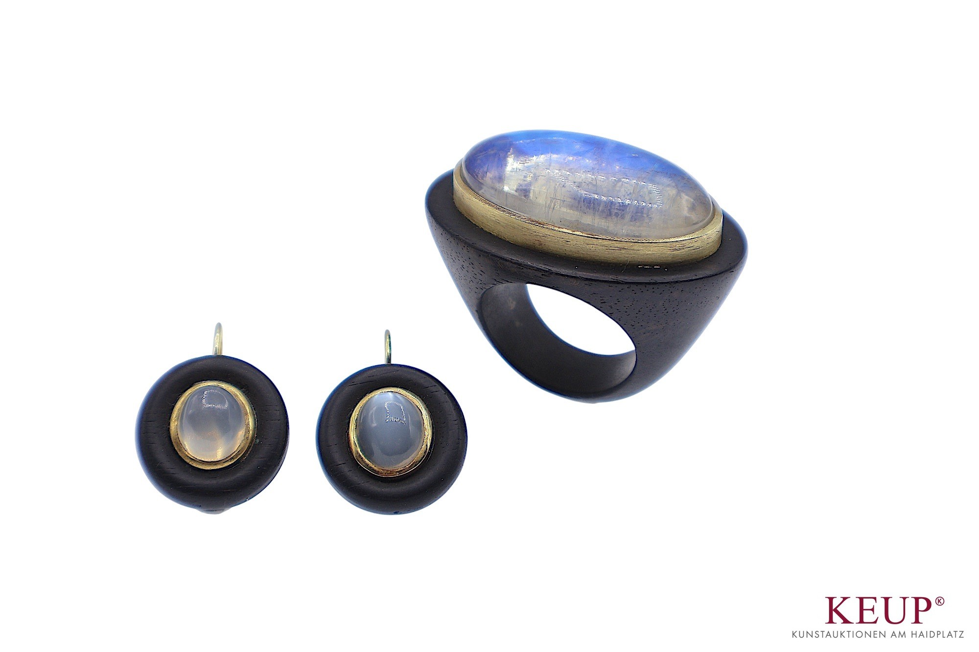 Schmuckset Ebenholz, Gold 585, Ring mit Regenbogen Mondstein ca. 42 ct., passend dazu Paar Ohrhänger, Länge ca. 2,5 cm, Provenienz: Landkreis Regensburg