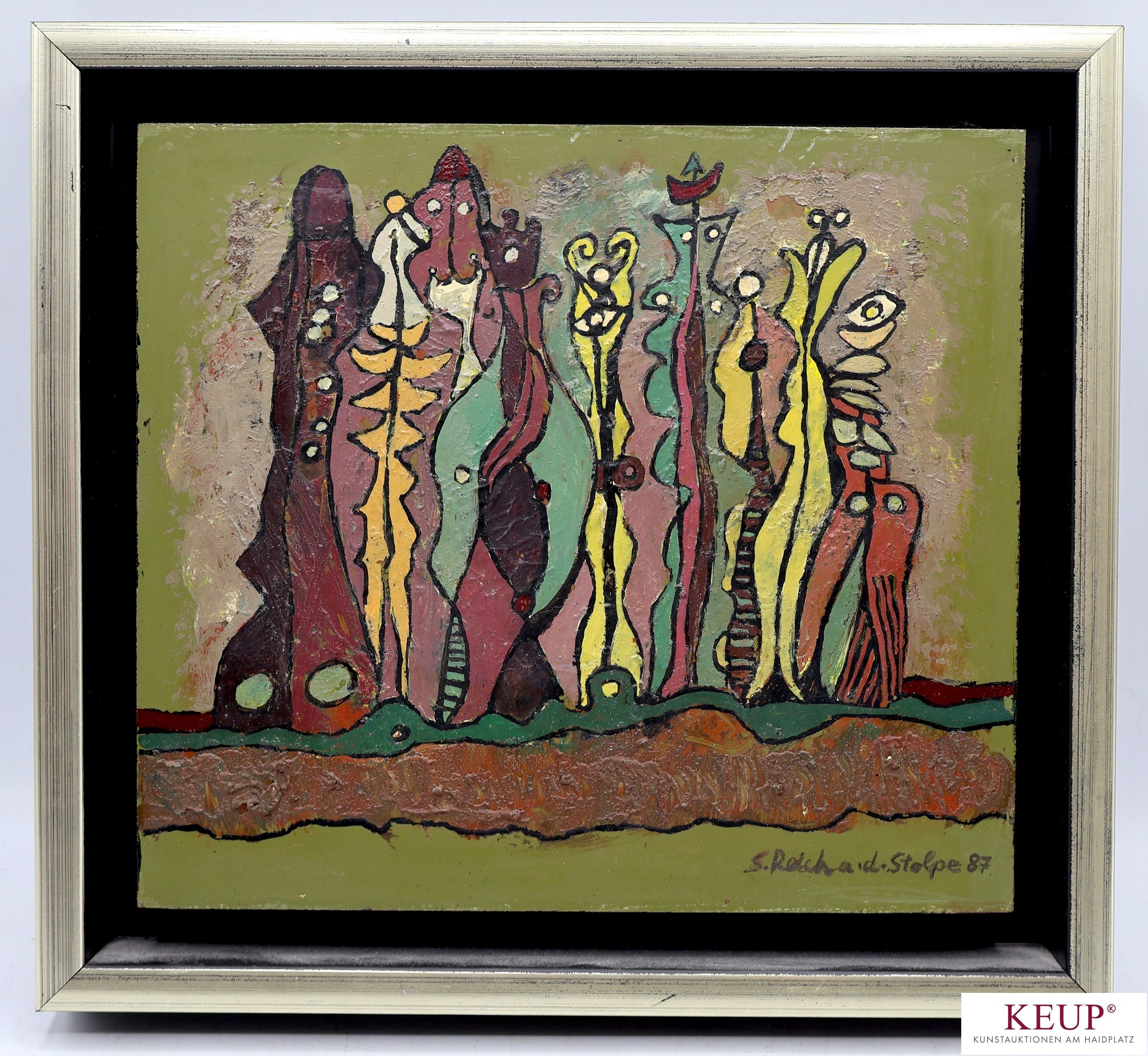 Mischtechnik - Siegfried Reich an der Stolpe (1912 Stolp - 2001 Altea) ''Versammlung'', signiert und datiert 87, Mischtechnik auf Holz, rückseitig Etikett Ausstellung der Künstlergilde in Esslingen, Maße Darstellung 18,5x20,5 cm, Rahmen, Provenienz: Private Kunstsammlung Oberpfalz, vgl. Lit.: Der Maler Siegfried Reich an der Stolpe studierte in den 30er Jahren in Berlin. Seine frühen Werke waren geprägt durch die Bekanntschaft mit zwei bedeutenden Vertretern des Expressionismus: Max Pechstein und Karl Schmidt-Rottluff. Es folgten Bilder, in denen er surrealistische und abstrakte Tendenzen aufgriff. Nach dem Zweiten Weltkrieg kam Reich von der Stolpe nach Frankfurt und wagte einen künstlerischen Neubeginn. Er war einer der Mitbegründer der Zimmergalerie Franck und beteiligte sich in den folgenden Jahren an dem Diskurs über neue Formen in der Kunst. 1951 wurde er von den Mitgliedern der Künstlergruppe ''COBRA'' eingeladen, um eine gemeinsame Ausstellung im Palais des Beaux-Arts in Lüttich zu realisieren. In den 50er Jahren wandte sich Reich an der Stolpe dem Informel zu. In den 60er Jahren zog er sich nach Spanien zurück.