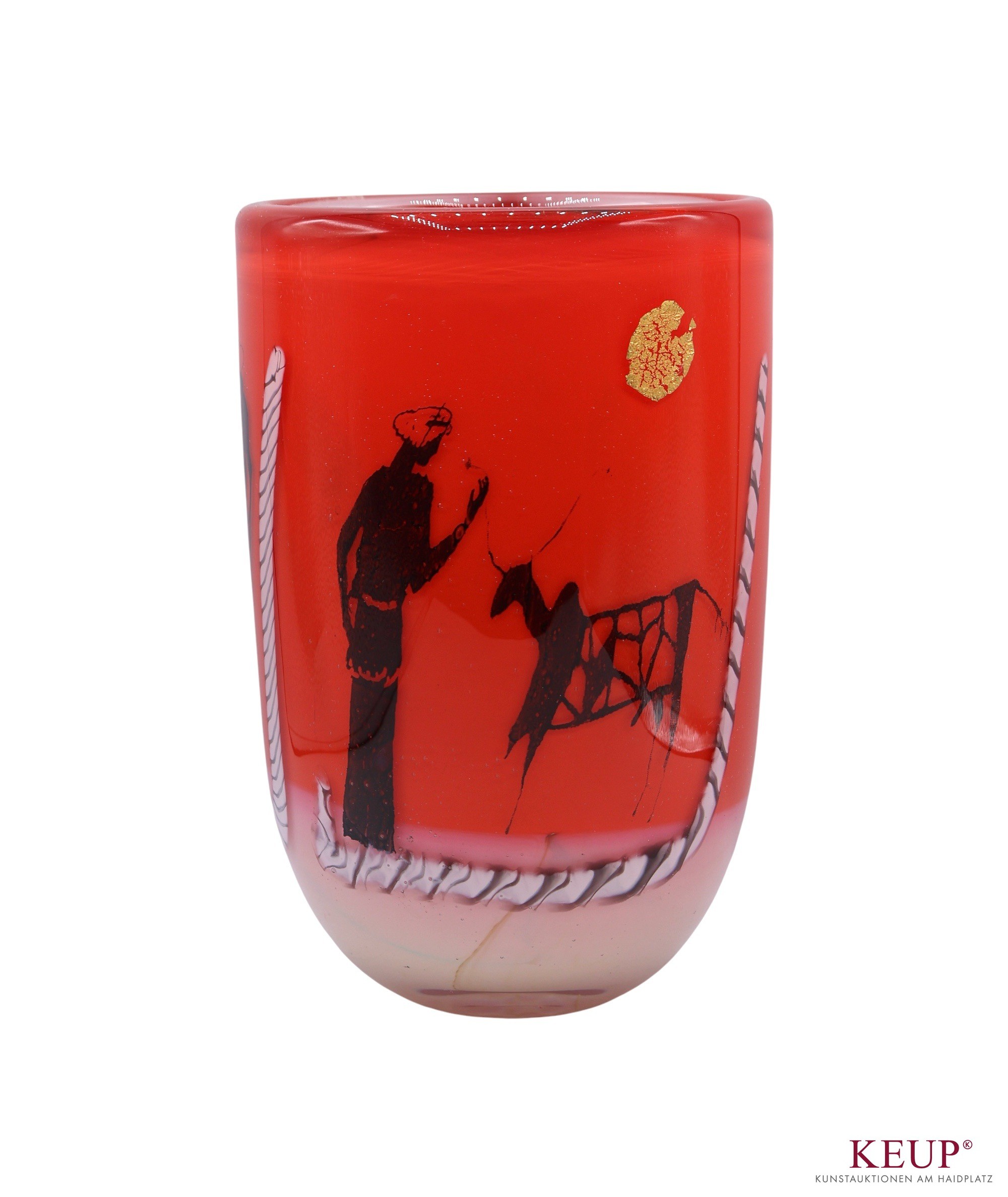 Glasobjekt - Susanne Precht (1960 Halle/Saale) ''Göttin mit Stier'', signiert, Vase, farblos, bunt staffiert, Höhe ca. 22 cm, Provenienz: Private Kunstsammlung Oberpfalz, vgl. Lit.: 1978 Praktikum in der Glaswerkstatt der HIF Halle in Quedlinburg, 1978-1983 Studium an der Kunsthochschule Halle Burg Giebichenstein, Fachbereich Glasgestaltung, Prof. Rüdiger Reinel, 1987 Mitglied des Verbandes Bildender Künstler der DDR, 1996 Stipendium des Freistaates Thüringen, 1998 Studienreise nach San Francisco, 2000-2002 Berufung zum Mitglied des Kunstbeirates des Freistaates Thüringen, 2008 Artist in Residence der Glashütte Eisch in Frauenau, Mitglied im: Verband Bildender Künstler Thüringen e.V., Bundesverband Bildender Künstlerinnen und Künstler Bundesverband Kunsthandwerk