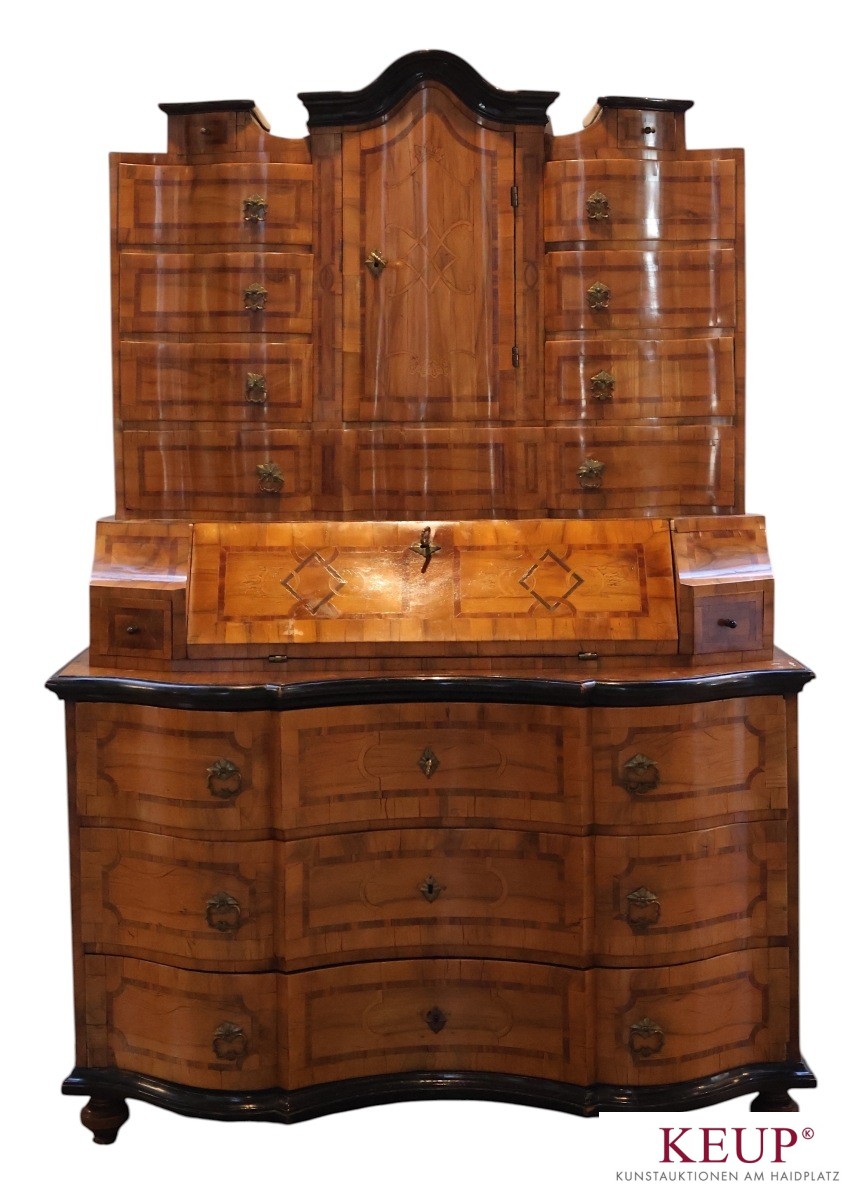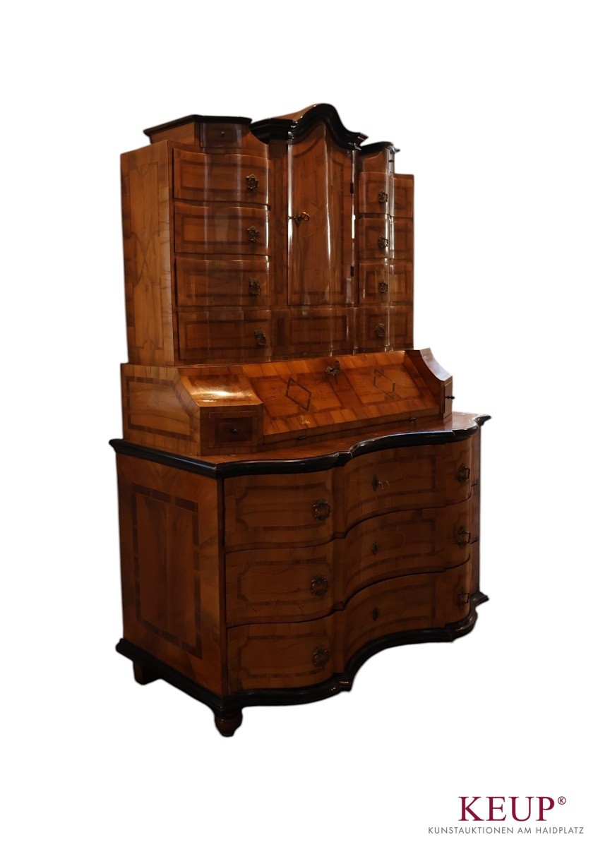Tabernakelsekretär - wohl süddeutsch oder Österreich 18.Jahrhundert Á Trois Corps, Nussbaum furniert, Band- und Blattintarsien, ebonisierte Profile, geschweifte dreischübige Kommode, Schreibaufsatz mit Klappe und Schubladen, Aufsatz 1-türig flankiert von neun Schubladen, gebogter Dachabschluss, Altersspuren (u.a. rest., Beschläge erg., Kommode Deckplatte rechts hinten fehlt Furnierstück), 195x133x70 cm, Provenienz: Privatsammlung Regensburg
