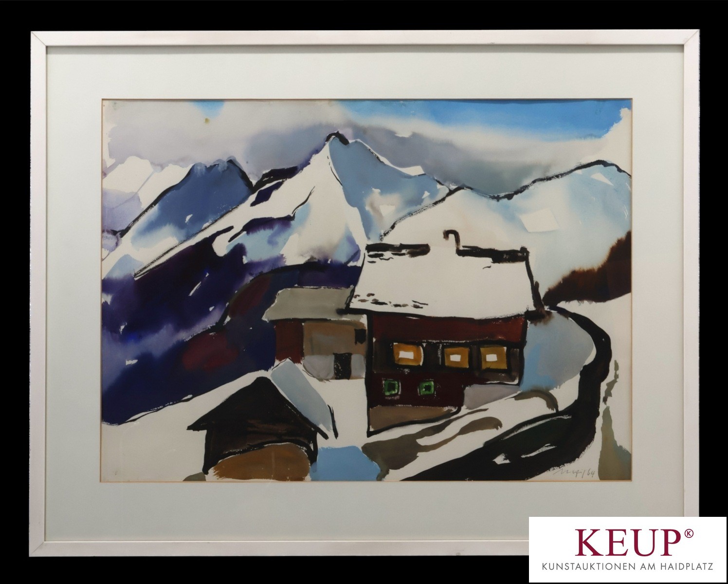Aquarell - Willi Ulfig (1910 Breslau - 1983 Regensburg) ''Winterlandschaft'', r.u. signiert und datiert (19)64, lasierende Farben auf Papier, Maße Darstellung ca. 46x64 cm, Passepartout, Rahmen, Gesamtmaße ca. 64x81 cm, Provenienz: Privatsammlung Regensburg, vgl. Lit. W.Amann: 1929 Studium an der Kunstakademie Breslau. Zwischen 1940 und 1945 sind alle seine Arbeiten durch Kriegseinwirkungen zerstört worden. Preise: 1965 Ostbayerischer Kulturpreis, 1971 Silb. Lamm, Brixen, 1974 Kulturpreis der Stadt Regensburg, etc.