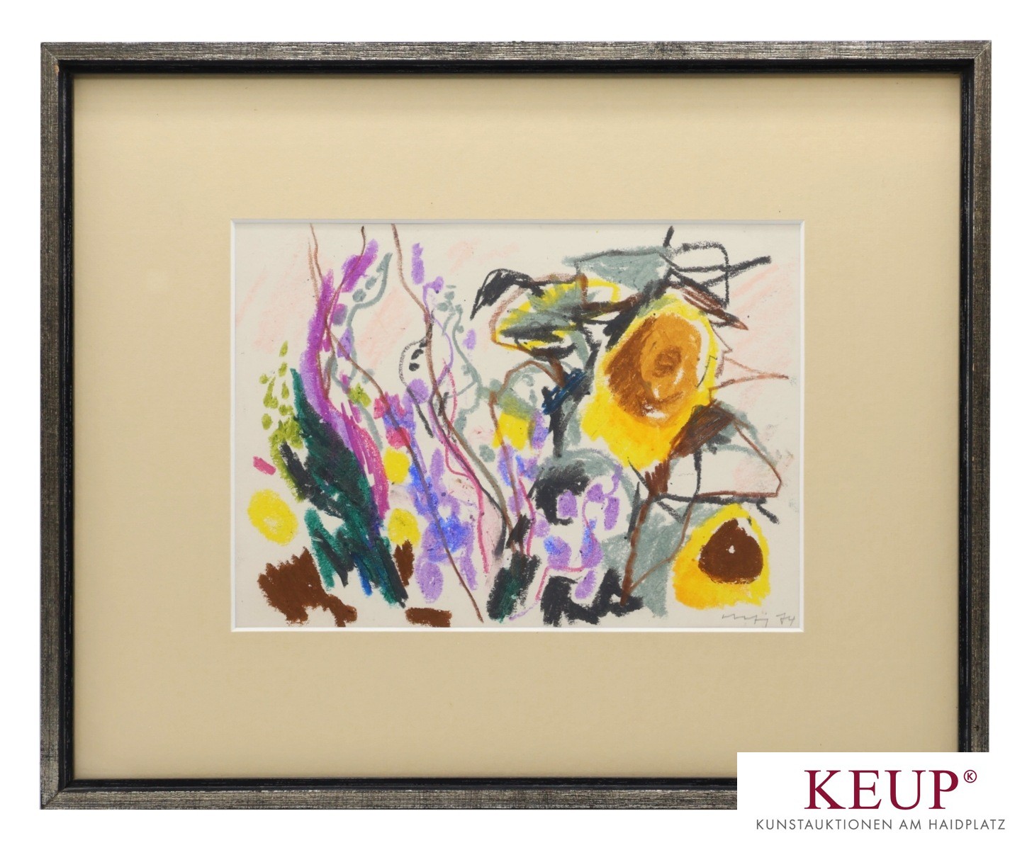Zeichnung - Willi Ulfig (1910 Breslau - 1983 Regensburg) ''Blumenwiese'', r.u. signiert und datiert (19)74, Wachskreide auf Papier, Maße Darstellung ca. 14x21 cm, Passepartout, Rahmen, Provenienz: Privatsammlung Regensburg, vgl. Lit. W.Amann: 1929 Studium an der Kunstakademie Breslau. Zwischen 1940 und 1945 sind alle seine Arbeiten durch Kriegseinwirkungen zerstört worden. Preise: 1965 Ostbayerischer Kulturpreis, 1971 Silb. Lamm, Brixen, 1974 Kulturpreis der Stadt Regensburg, etc.