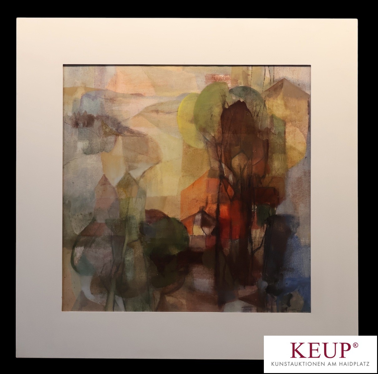 Großes Aquarell - Willi Ulfig (1910 Breslau - 1983 Regensburg) ''Moderne Landschaft'', signiert, lasierende Farben auf Papier, Maße Darstellung ca. 69x69 cm, Rahmen, Gesamtmaße ca. 95x95 cm, Provenienz: Privatsammlung Regensburg, vgl. Lit. W.Amann: 1929 Studium an der Kunstakademie Breslau. Zwischen 1940 und 1945 sind alle seine Arbeiten durch Kriegseinwirkungen zerstört worden. Preise: 1965 Ostbayerischer Kulturpreis, 1971 Silb. Lamm, Brixen, 1974 Kulturpreis der Stadt Regensburg, etc.