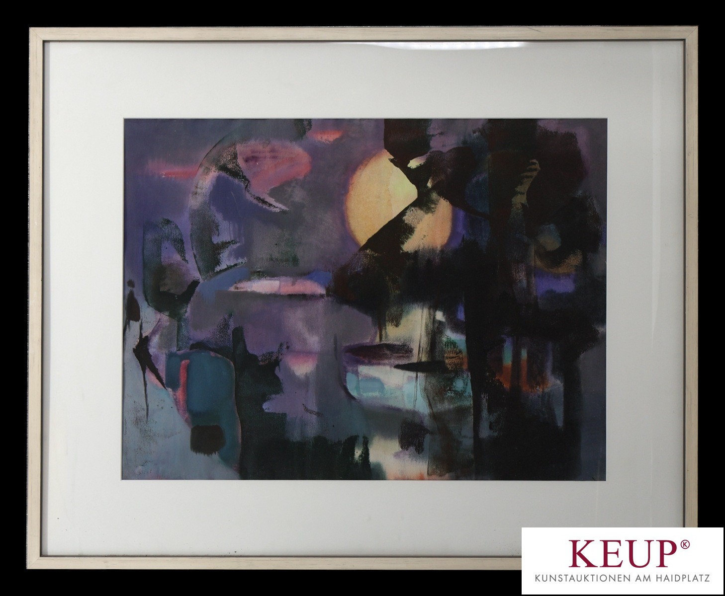 Großes Aquarell - Willi Ulfig (1910 Breslau - 1983 Regensburg) ''Moderne Landschaft'', lasierende Farben auf Papier, rückseitig Authentifizierung durch Nachlassstempel und Bestätigung der Originalität, Maße ca. 55x74 cm, Rahmen, Gesamtmaße ca. 84x103 cm, Provenienz: Privatsammlung Regensburg, vgl. Lit. W.Amann: 1929 Studium an der Kunstakademie Breslau. Zwischen 1940 und 1945 sind alle seine Arbeiten durch Kriegseinwirkungen zerstört worden. Preise: 1965 Ostbayerischer Kulturpreis, 1971 Silb. Lamm, Brixen, 1974 Kulturpreis der Stadt Regensburg, etc.