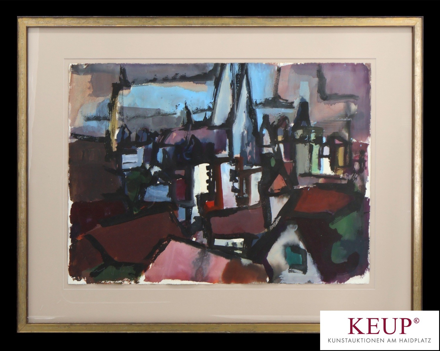 Aquarell - Willi Ulfig (1910 Breslau - 1983 Regensburg) ''Stadtansicht Regensburg'', l.u. signiert, lasierende Farben auf Papier, Maße Darstellung ca. 48x65 cm, Rahmen, Provenienz: Privatsammlung Regensburg, vgl. Lit. W.Amann: 1929 Studium an der Kunstakademie Breslau. Zwischen 1940 und 1945 sind alle seine Arbeiten durch Kriegseinwirkungen zerstört worden. Preise: 1965 Ostbayerischer Kulturpreis, 1971 Silb. Lamm, Brixen, 1974 Kulturpreis der Stadt Regensburg, etc.