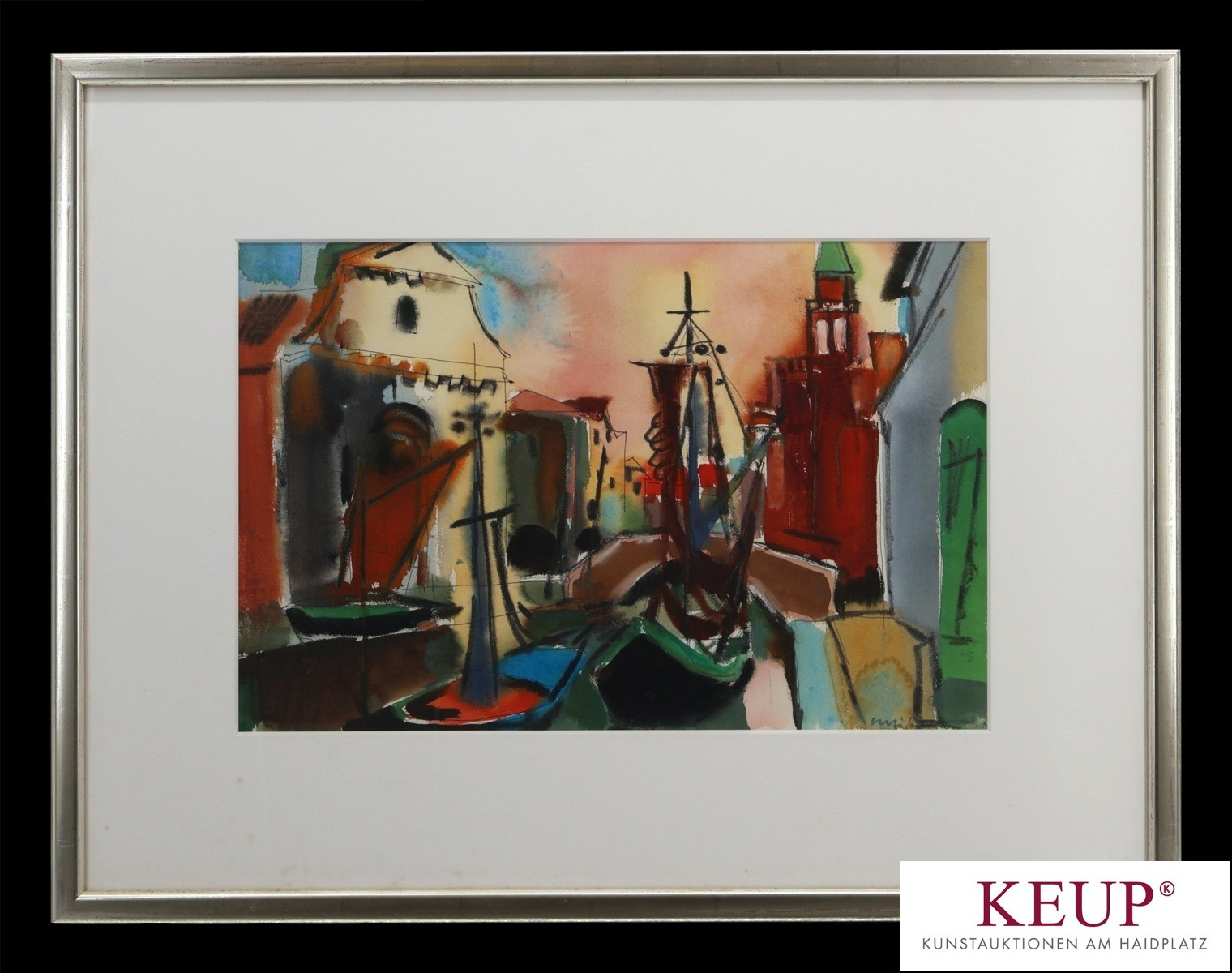 Aquarell - Willi Ulfig (1910 Breslau - 1983 Regensburg) ''Ansicht von Chioggia ? in Italien'', r.u. signiert, datiert (19)69, lasierende Farben auf Papier, Maße Darstellung ca. 30x45 cm, Rahmen, Gesamtmaße ca. 53x69 cm, Provenienz: Privatsammlung Regensburg, vgl. Lit. W.Amann: 1929 Studium an der Kunstakademie Breslau. Zwischen 1940 und 1945 sind alle seine Arbeiten durch Kriegseinwirkungen zerstört worden. Preise: 1965 Ostbayerischer Kulturpreis, 1971 Silb. Lamm, Brixen, 1974 Kulturpreis der Stadt Regensburg, etc.