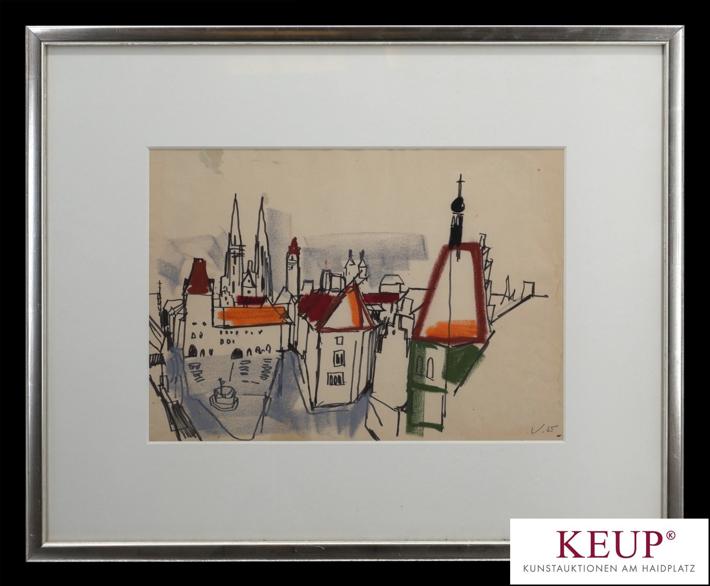 Zeichnung - Willi Ulfig (1910 Breslau - 1983 Regensburg) ''Blick auf Regensburg mit Haidplatz und Dom'', r.u. monogrammiert U und datiert (19)65, Buntstift / Kreide auf Papier, Maße Darstellung ca. 28,5x40 cm, Passepartout, Rahmen, Gesamtmaße ca. 52x64 cm, Provenienz: Privatsammlung Regensburg, vgl. Lit. W.Amann: 1929 Studium an der Kunstakademie Breslau. Zwischen 1940 und 1945 sind alle seine Arbeiten durch Kriegseinwirkungen zerstört worden. Preise: 1965 Ostbayerischer Kulturpreis, 1971 Silb. Lamm, Brixen, 1974 Kulturpreis der Stadt Regensburg, etc.