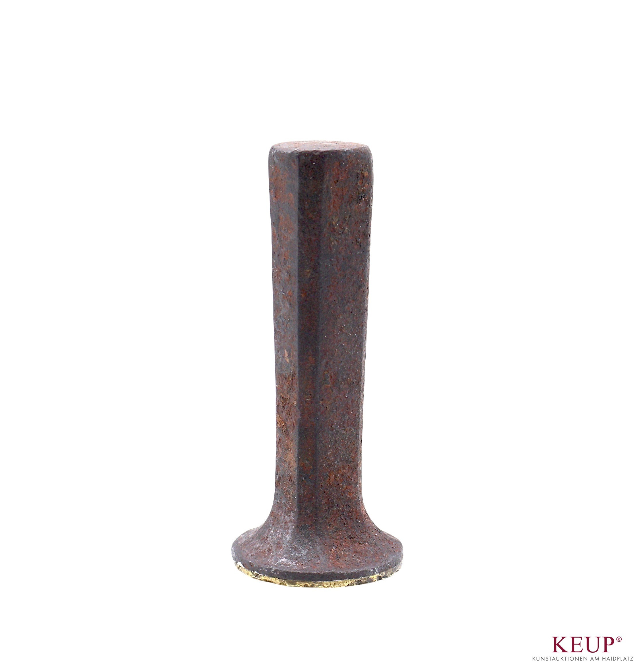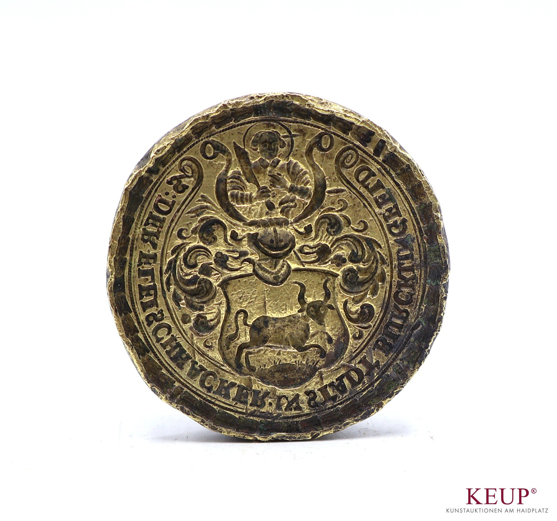 Zunftsiegel - deutsch 17./18.Jahrhundert Messingsiegelplatte mit Eisenhandhabe, Wappen mit barockem Zierwerk, Ochse und Heiliger Lukus oder Bartholomäus, Inschrift:'' Der Fleischhacker in der Stadt Burcklingfeld (Burg Lengenfeld ?), Länge ca. 10,5 cm, d.= ca. 4,2 cm, Altersspuren, Provenienz: Privatbesitz Oberpfalz