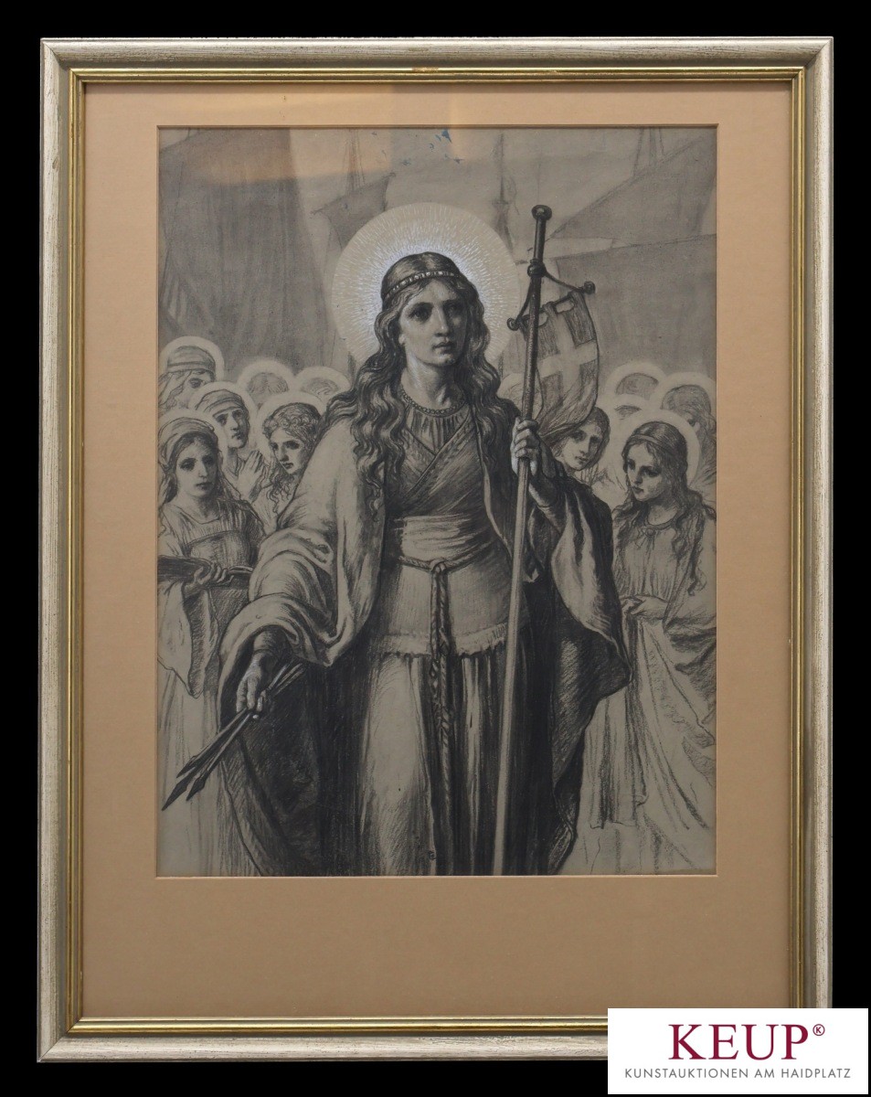 Zeichnung - evtl. Georg Kau (1870 Neuß - 1947 München) ''Heilige Ursula'', Bleistift auf Papier, teilweise weiß gehöht, rückseitig beschriftet, Maße Darstellung ca. 46x34 cm, Passepartout, Rahmen, Gesamtmaße ca. 62x48 cm, Provenienz: Privatsammlung Regensburg