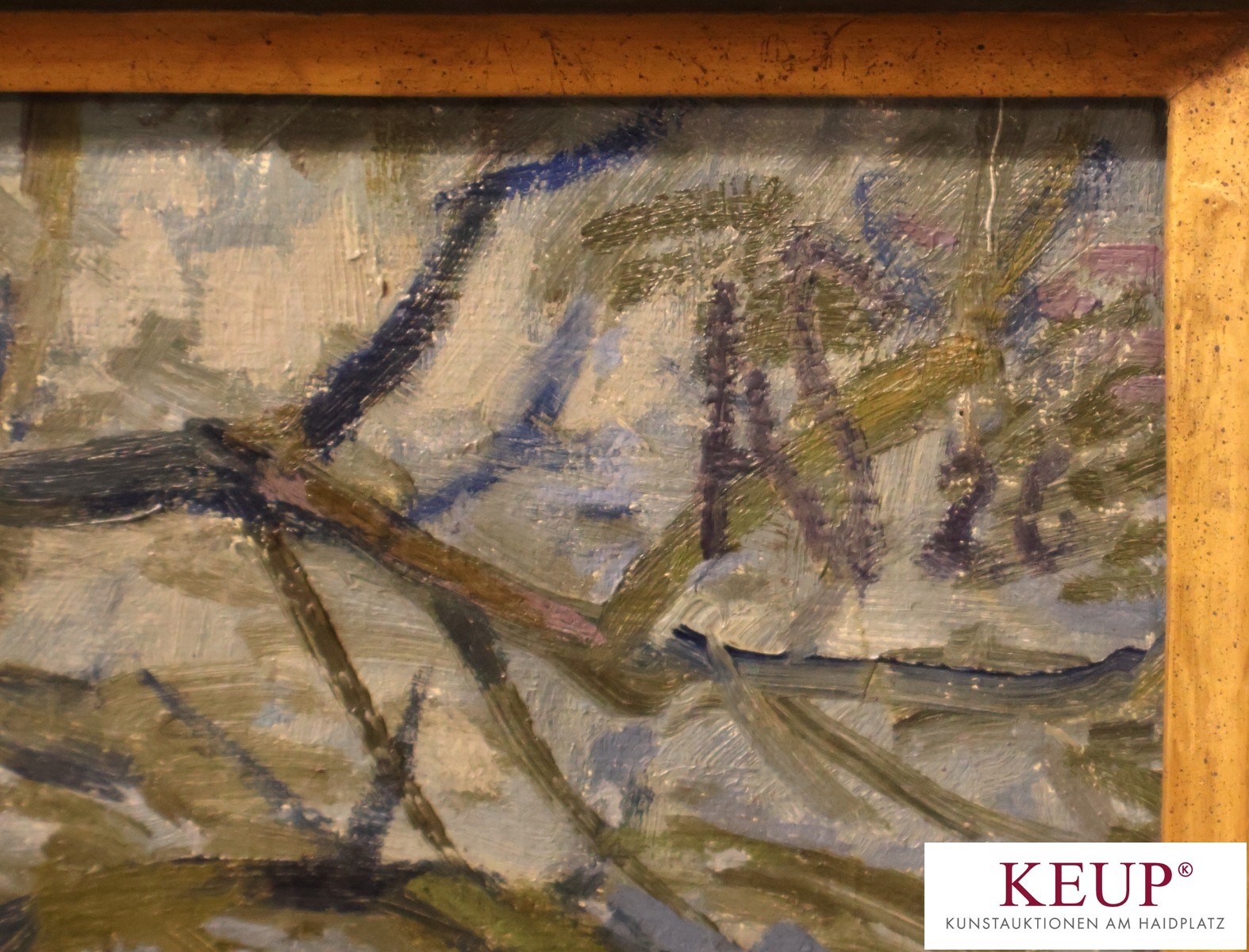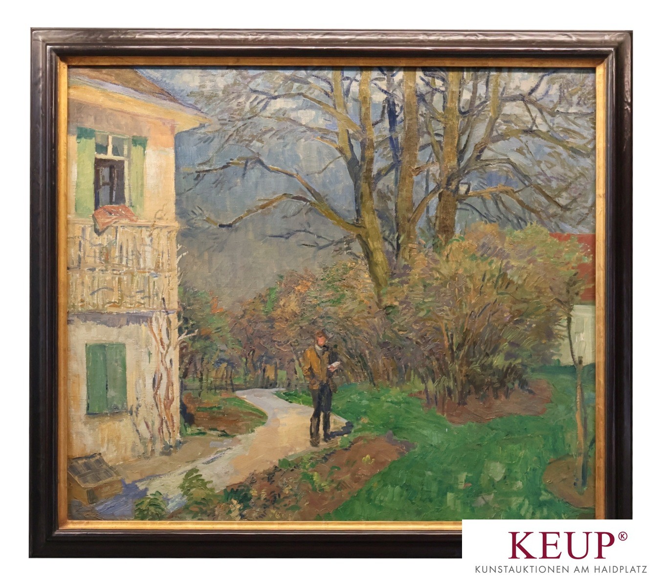 Gemälde - Adolf SCHINNERER (1876 Schwarzenbach an der Saale - 1949 Ottershausen bei Haimhausen in Oberbayern) ''Park mit Villa, Weg mit lesendem Mann (evtl. Selbstbildnis, r.o. monogrammiert AS und datiert wohl 26, Öl auf Leinwand, Maße Darstellung ca. 79x90 cm, Provenienz: Privatsammlung Regensburg, anbei Gutachten in Kopie von 1989 für den Kunsthandel mit einem angegebenen Verkaufspreis von 32.000.- DM, Rahmen, Gesamtmaße ca. 90x102 cm, vgl Lit.: Studium an der Kunstakademie in Karlsruhe bei Walter Conz, Schmid-Reutte und Wilhelm Trübner; Später Studium an der Akademie der Bildenden Künste in München; 1909/1910 Villa Romana Preis; 1920 Berufung an die Staatliche Kunstgewerbeschule München; 1913 Mitbegründer der Neuen Sezession; ab 1924 Professur an der Akademie;