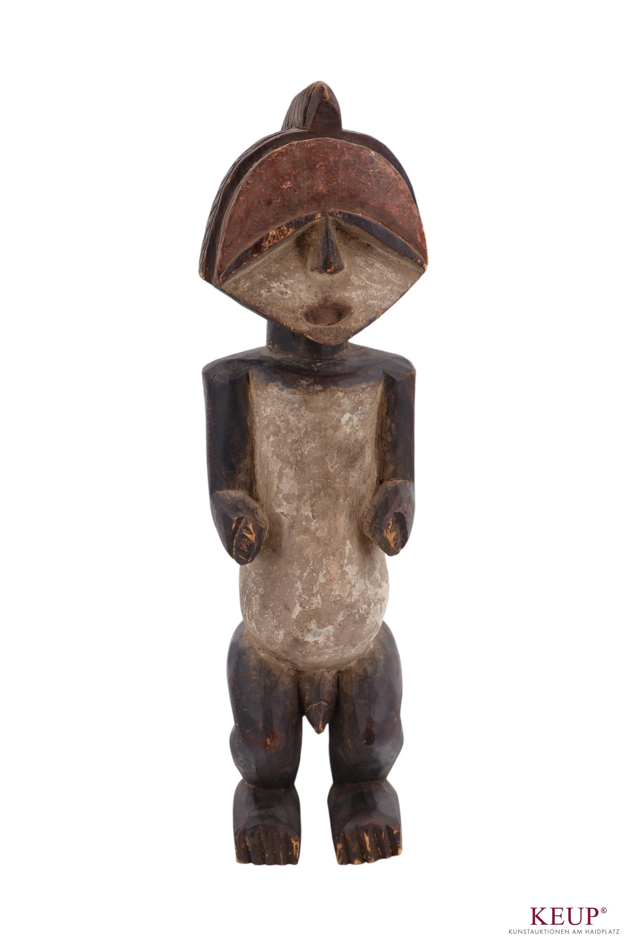 Afrikanische Kunst - wohl Ambete Burkina Faso braunes Holz mit heller Patina, Kopfbedeckung, geschwollener Bauch, männliche Figur, Altersspuren, Höhe ca. 61 cm (Provenienz: Privatbesitz Regensburg)