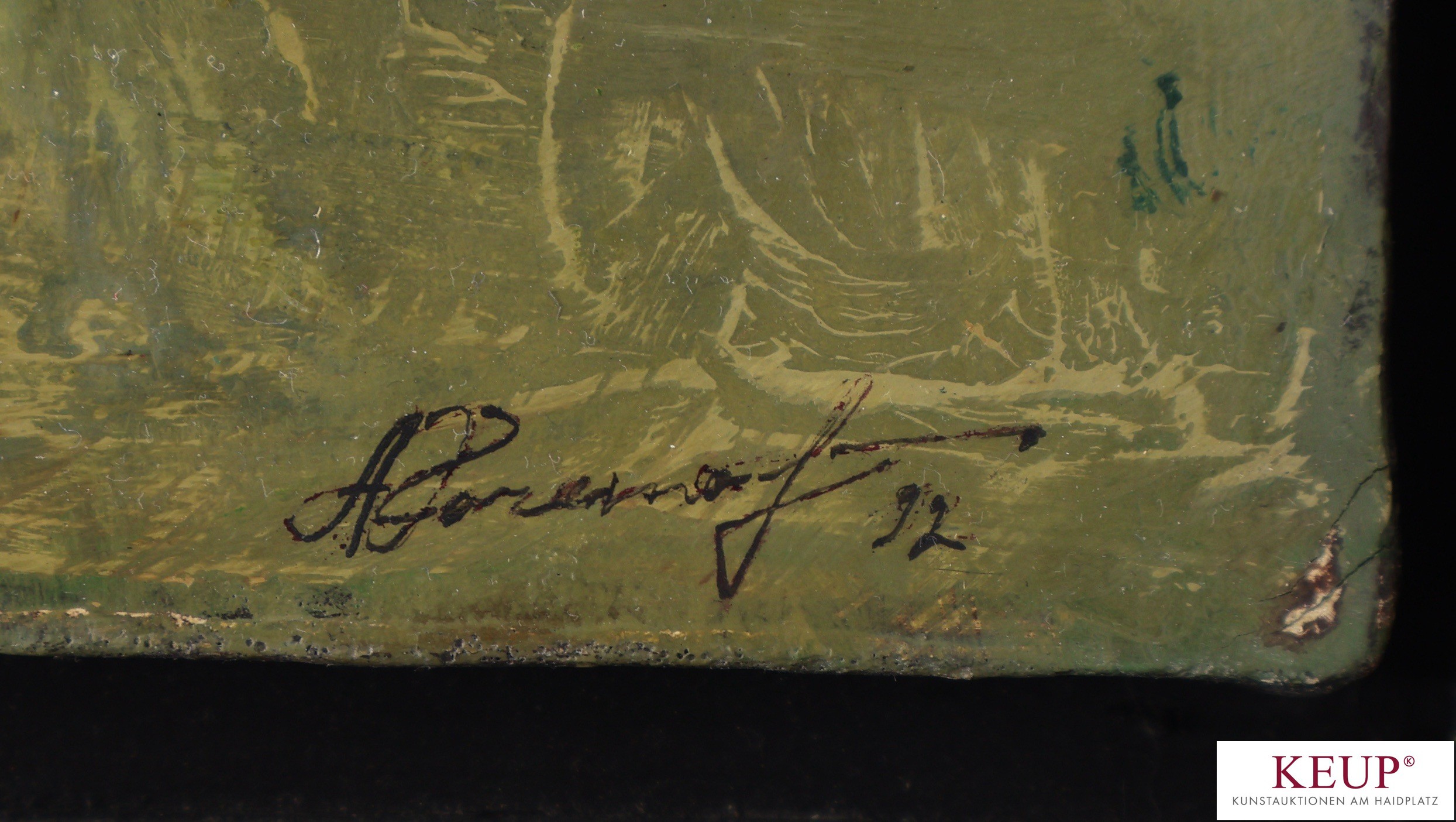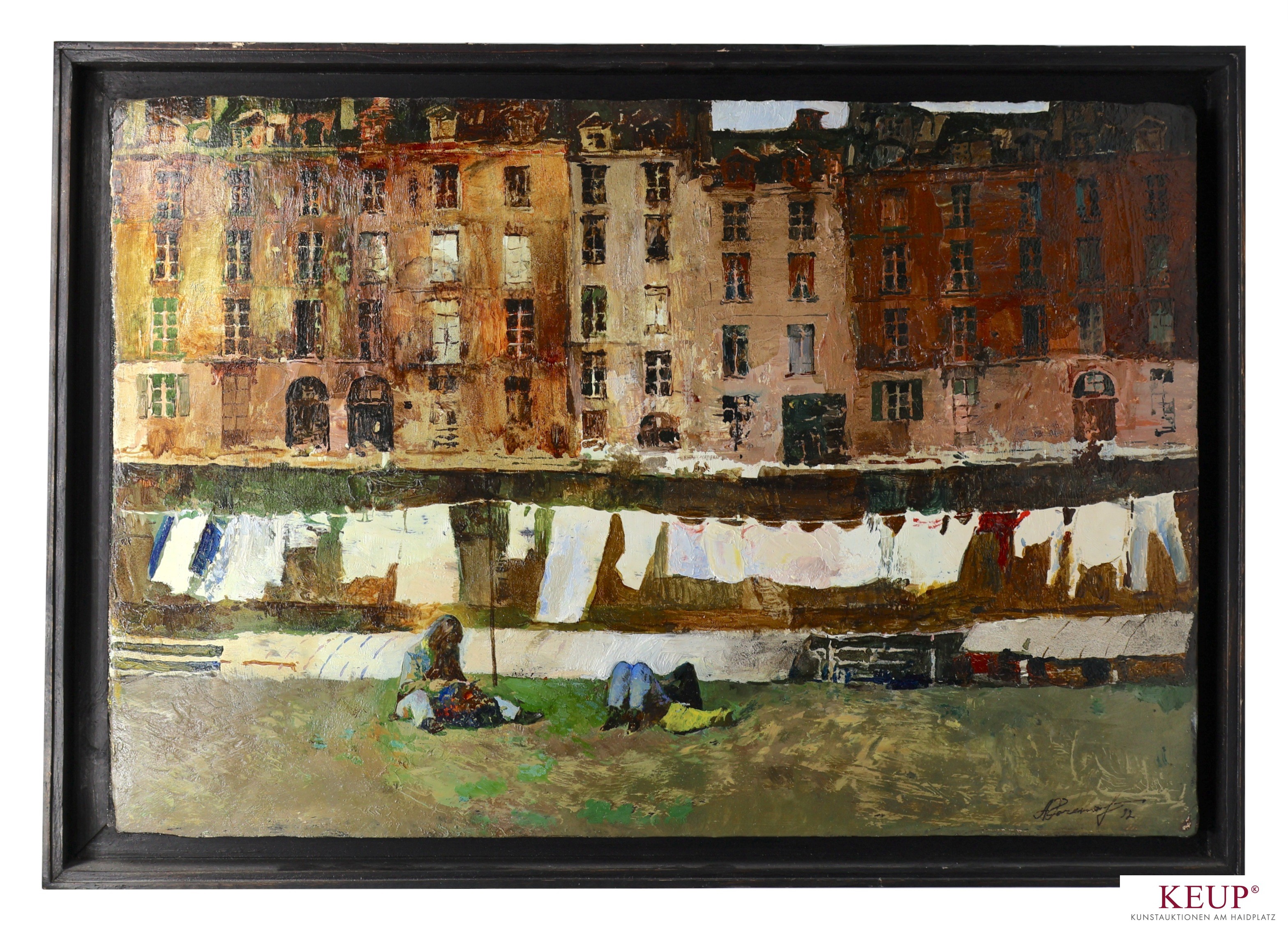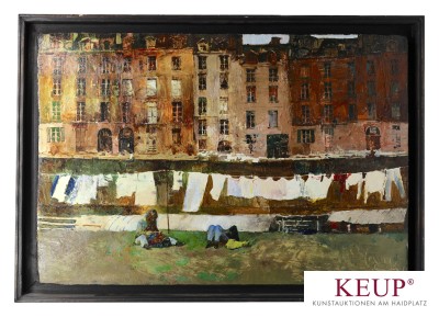 Gemälde - Alexander Kotchetow (1966 Kiew Ukraine - 2019 München) ''Großstadtansicht mit Häuserzeile, im Vordergrund Vorhof mit Wäscheleine und Personenstaffage'', r.u. signiert, datiert (19)92, Öl auf Holz, Maße Darstellung ca. 29x43 cm, Rahmen, Provenienz: Privatbesitz Regensburg, vgl. Lit.: 1985 Abschlussdiplom der Kunstschule in Kiew, 1987 Studium an der Akademie der Bildenden Künste in Kiew, 1992 Stipendium an der Akademie der Bildenden Künste in München, 1993 Abschlussdiplom der Akademie der Bildenden Künste in Kiew, 1997 lebte als Künstler Resident mit seiner Frau in München