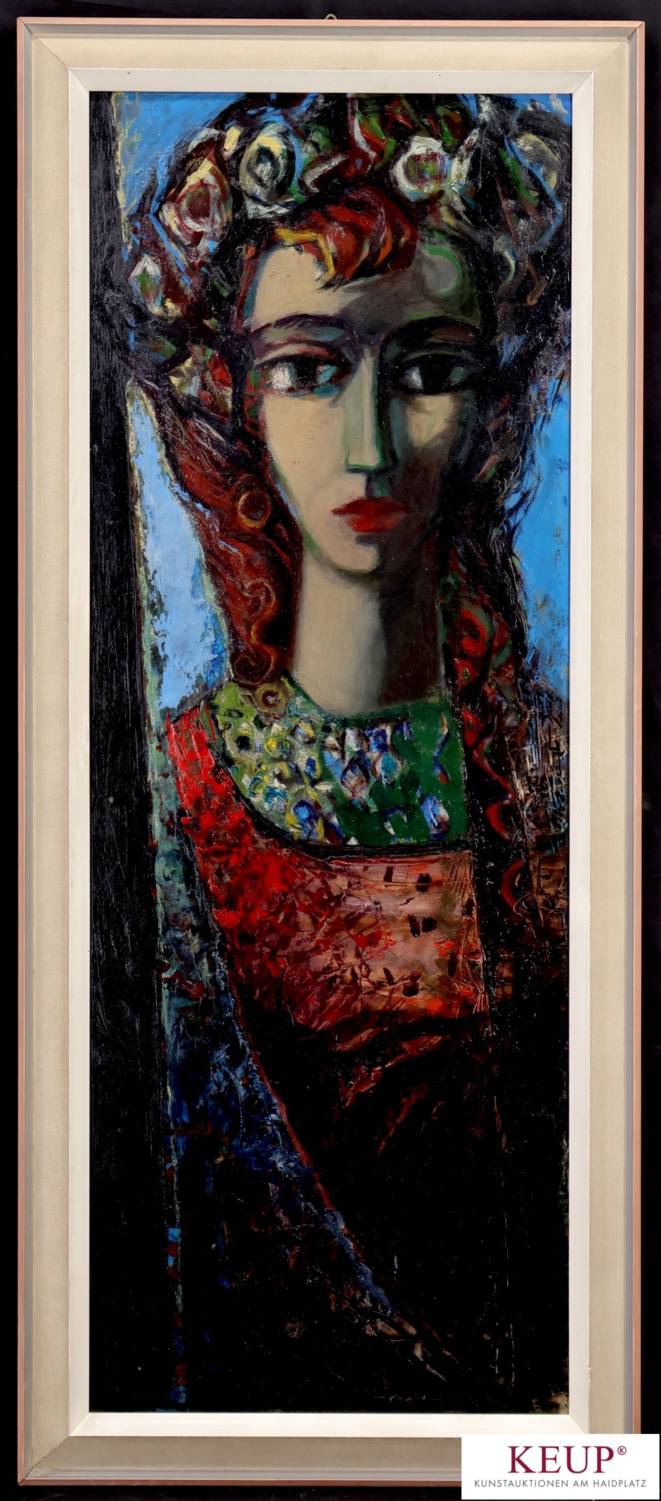 Gemälde - Alfons Maria Bauer (1912 Arrach bei Falkenstein - 1998) ''Mädchen mit Blütenkranz'', unsigniert, Öl auf Karton, Maße 80x30 cm, Rahmen, Provenienz: Privatbesitz Regensburg, vgl. Lit.: 1931-36 Studium an der Akademie der Bildenden Künste München bei Prof. Emil Preetorius, Staatsexamen für Kunsterziehung, 1948-1977 Kunsterzieher am Albrecht-Altdorfer-Gymnasium in Regensburg. Seit 1992 Lehrer an der Stadtkunst. Lebte und arbeitete in Falkenstein.