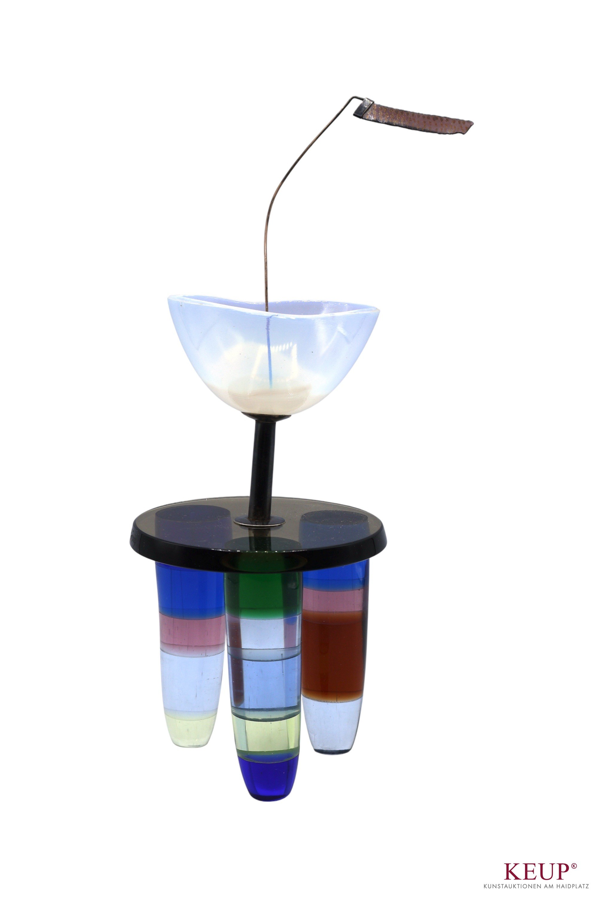 Glasobjekt - Alina Görny (1948) ''Napoleon'', Ritzsignatur, Glasturm mit Metallfahne, farbloses Glas mit Einschmelzungen, Höhe ca. 26 cm, Provenienz: Private Kunstsammlung Oberpfalz, vgl. Lit.: Glaskünstlerin, Ausbildung an der Hochschule für Bildende Künste in Breslau; Mitarbeit im Glasstudio Lobmeyr, Baden bei Wien, in der Glashütte Hergiswil Schweiz; Zusammenarbeit mit Joel Philip Myers, David Huchthausen und Dale Chihuly; lebt und arbeitet in Baden bei Wien.