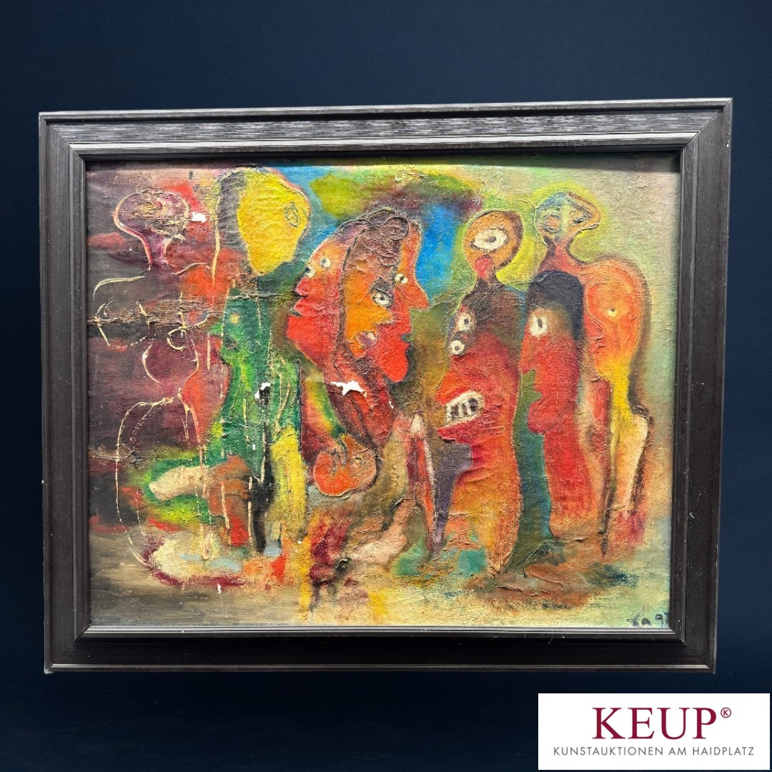 Gemälde - Anonymer Künstler (XX.Jahrhundert) ''Köpfe'', r.u. unleserlich monogrammiert, datiert 97, Öl auf Leinwand, Maße Darstellung ca. 67x83 cm, Altersspuren (teilweise Farbabplatzungen), Rahmen, Provenienz: Privatbesitz Regensburg
