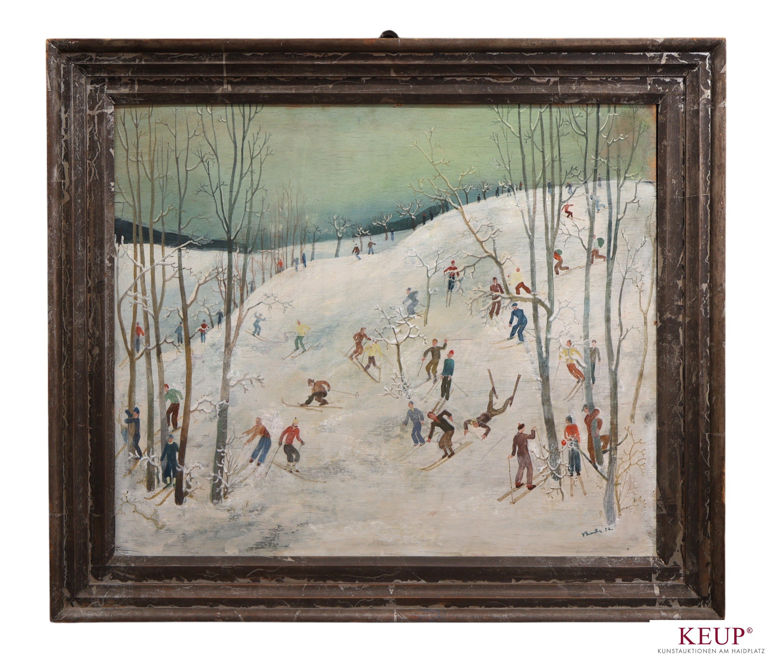 Gemälde - Anonymer Künstler (XX.Jahrhundert) ''Übungswiese mit Skifahrern'', in Anlehnung an den Magischen Realismus, r.u. unleserlich signiert und datiert, Öl auf Malerplatte, Maße Darstellung ca. 50x60 cm, Rahmen, Gesamtmaße ca. 61x73 cm, Provenienz: Privatbesitz Regensburg