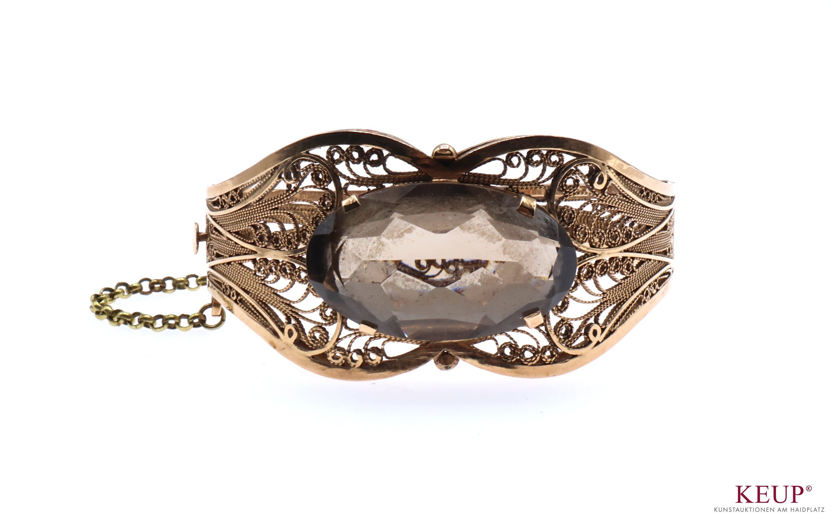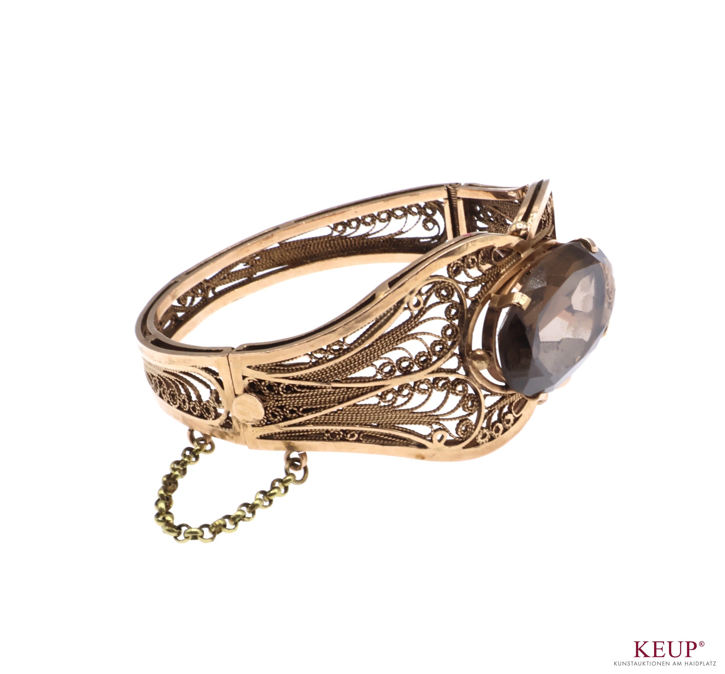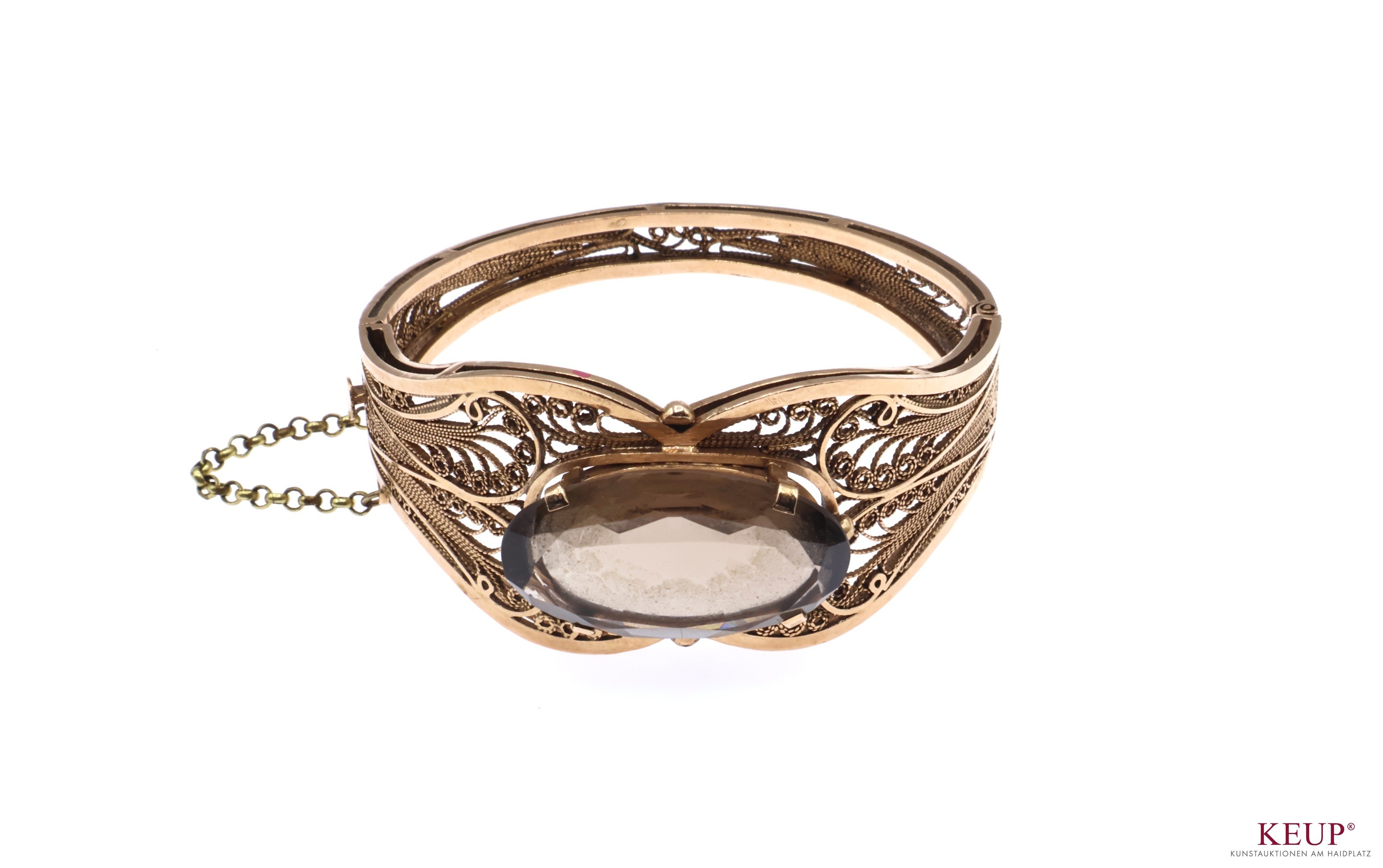 Goldenes Armband Gold geprüft 14 K, mit großem Topaz ausgefasst (Maße ca. 3,3x2 cm), filigrane durchbrochene Arbeit, Steckverschluss mit Sicherheitskette, d.= 6,5 cm, ca. 46 Gr., Provenienz: Privatbesitz Chiemgau