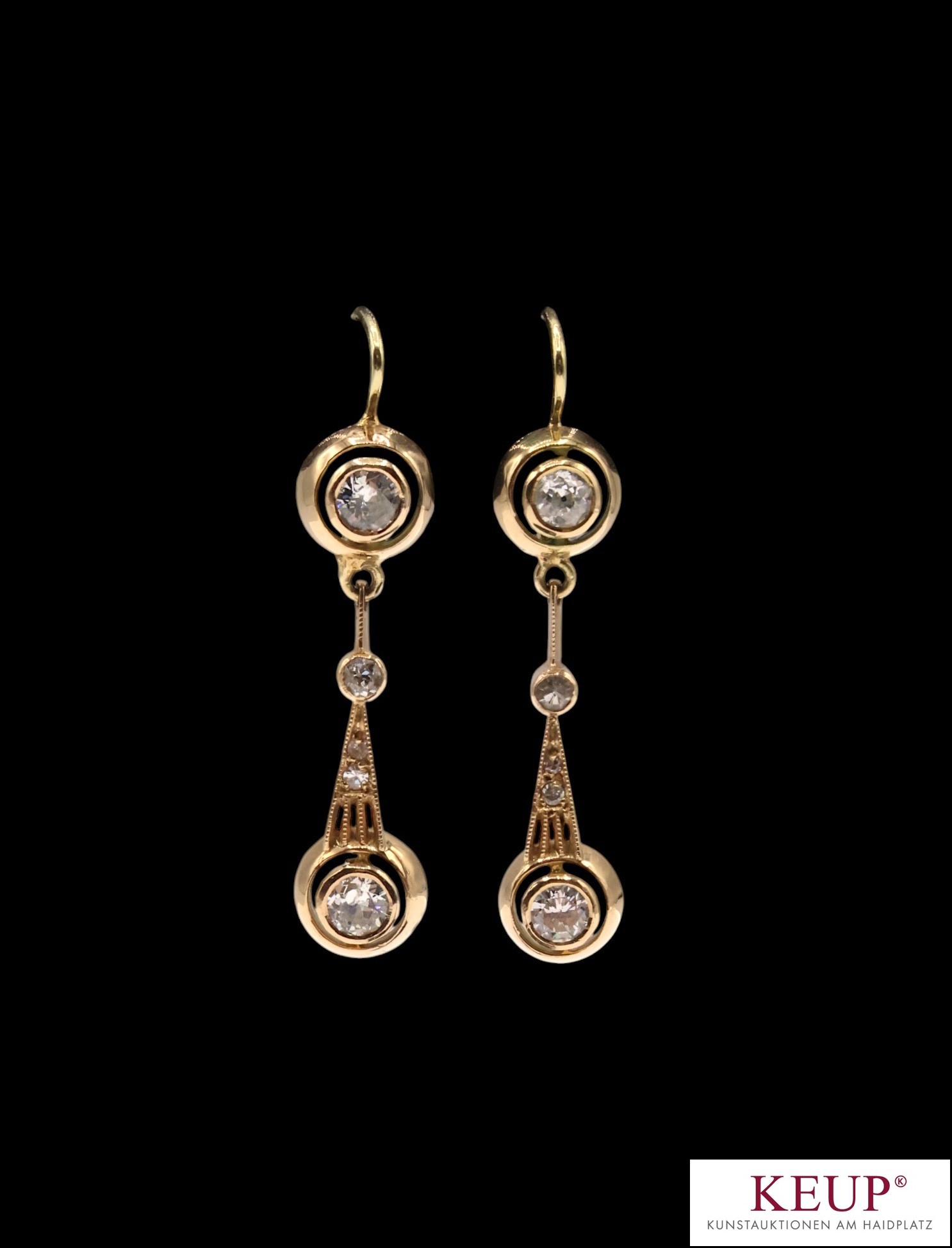 Art Deco Ohrringe - wohl deutsch um 1920 Gelbgoldfassung gest. 585, undeutliche Meistermarke wohl F.F., verziert mit vier Diamanten (ca. 0,8 ct.) und vier kl. Diamantrosen, 5 Gr., Länge ca. 38 mm, Provenienz: Privatbesitz Chiemgau