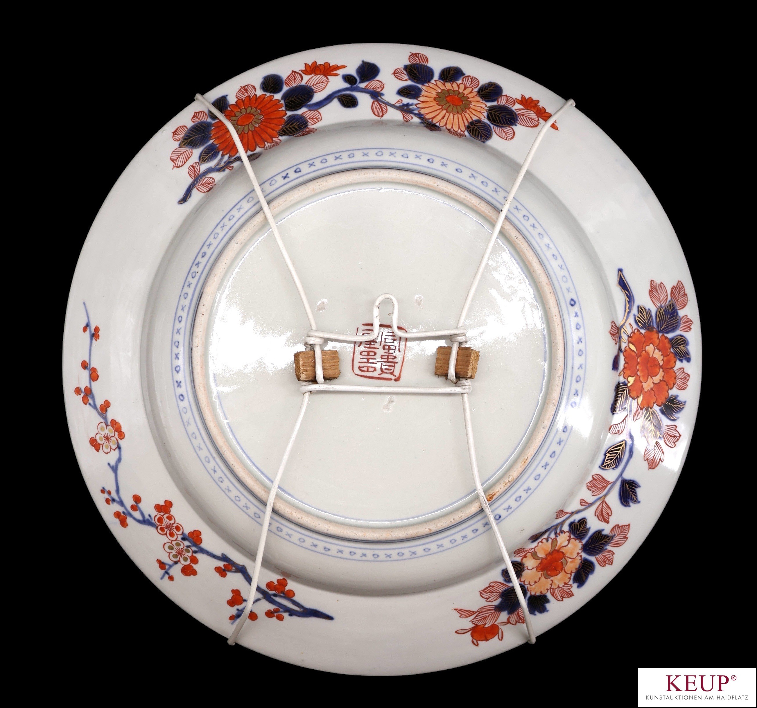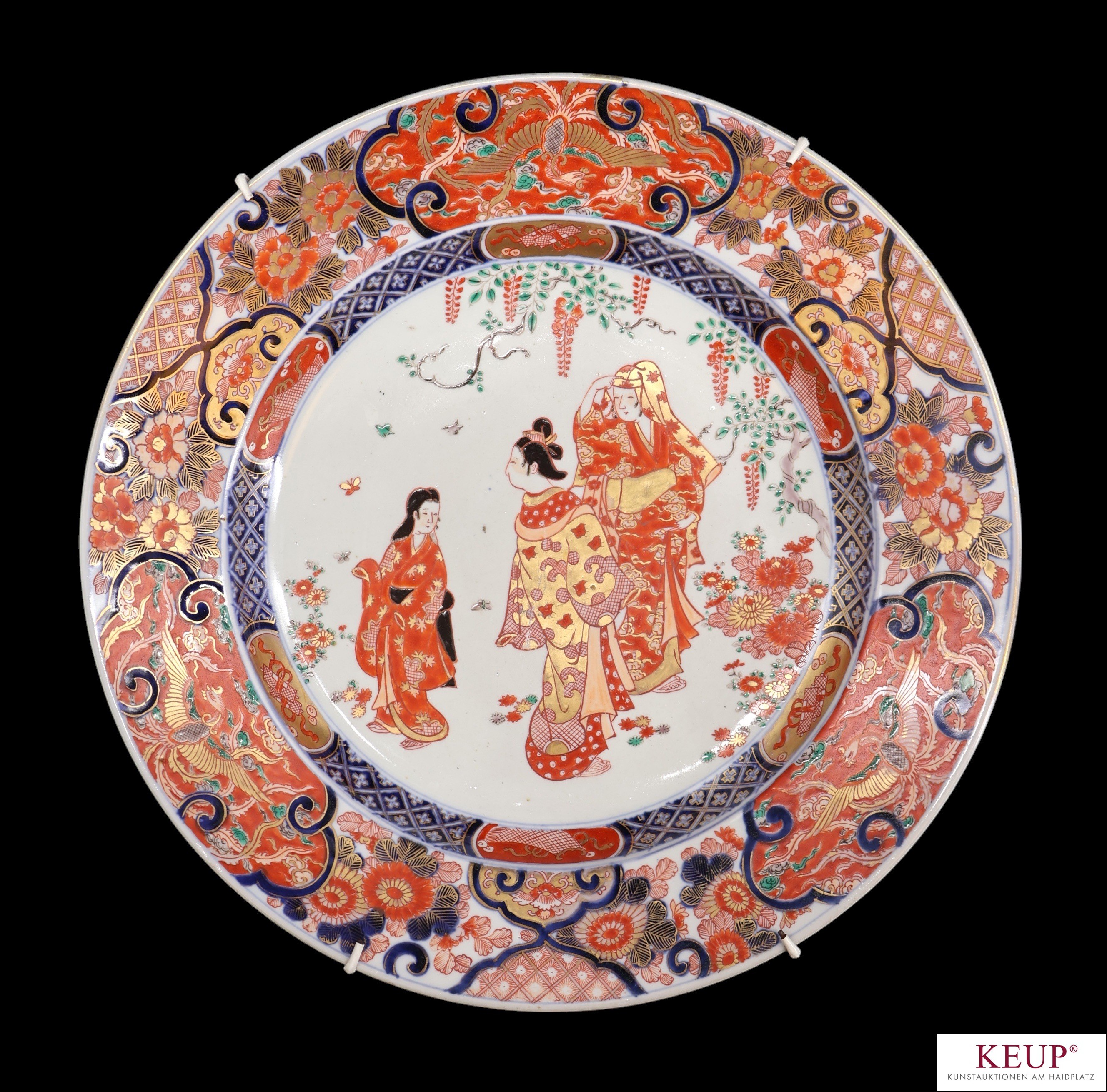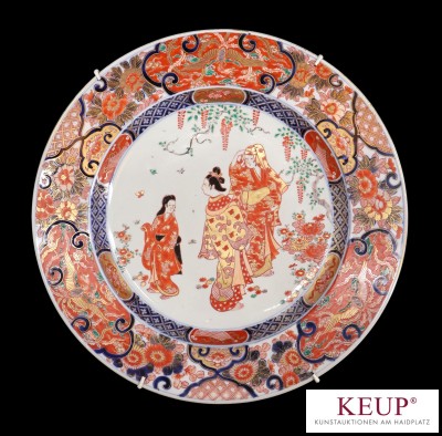 Große Kutani Sammelplatte - wohl Japan 19./20.Jahrhundert Porzellan bunt staffiert, im Spiegel Figurenstaffage, breite Fahne mit floralem Dekor, d.= ca. 40 cm, Provenienz: Nürnberg