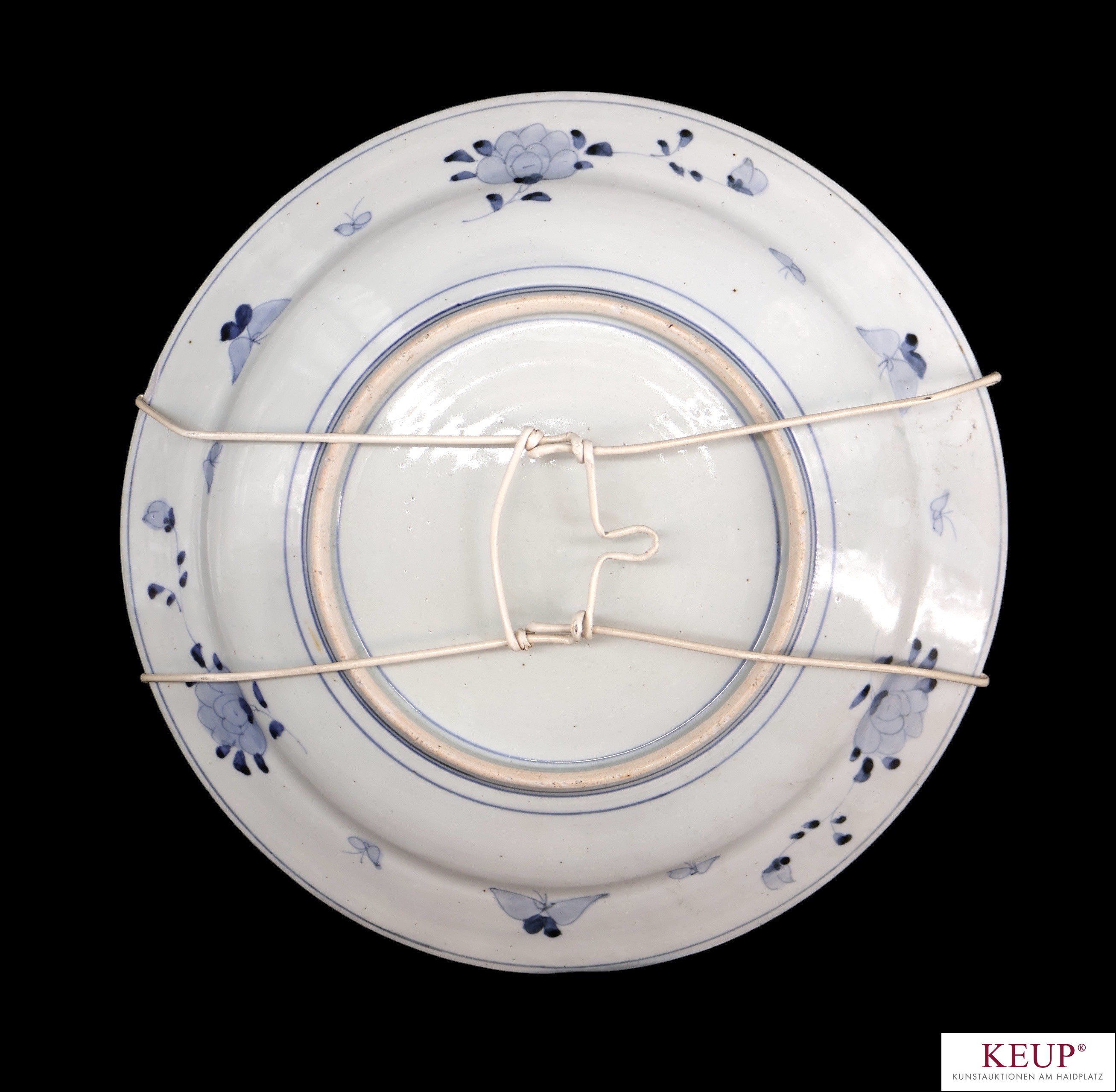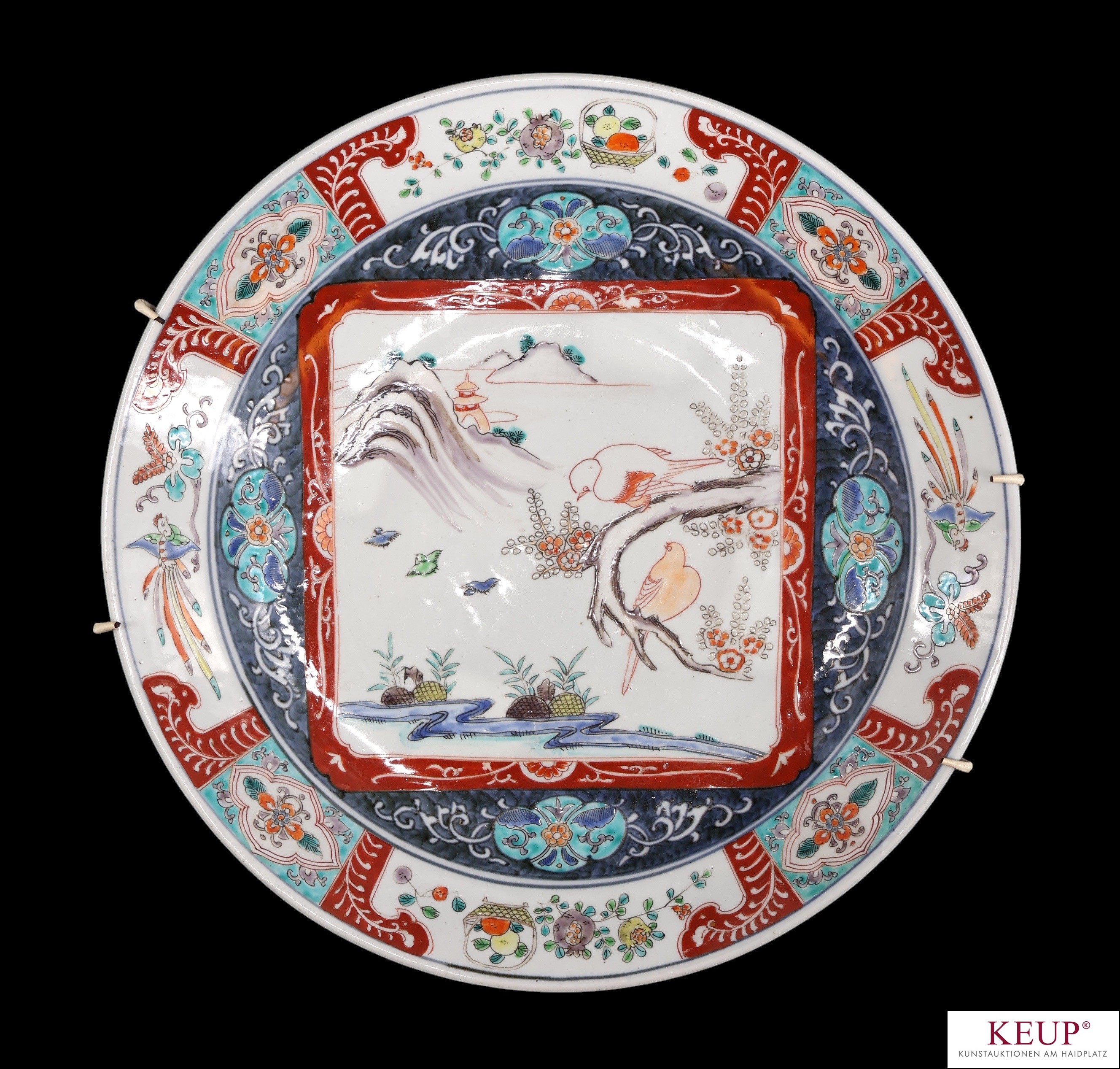 Große Imari Sammelplatte - wohl Japan 19./20.Jahrhundert Porzellan bunt staffiert, im Spiegel Tempelanlage und Tierstaffage, breite Fahne mit floralem Dekor, d.= ca. 40 cm, Provenienz: Nürnberg