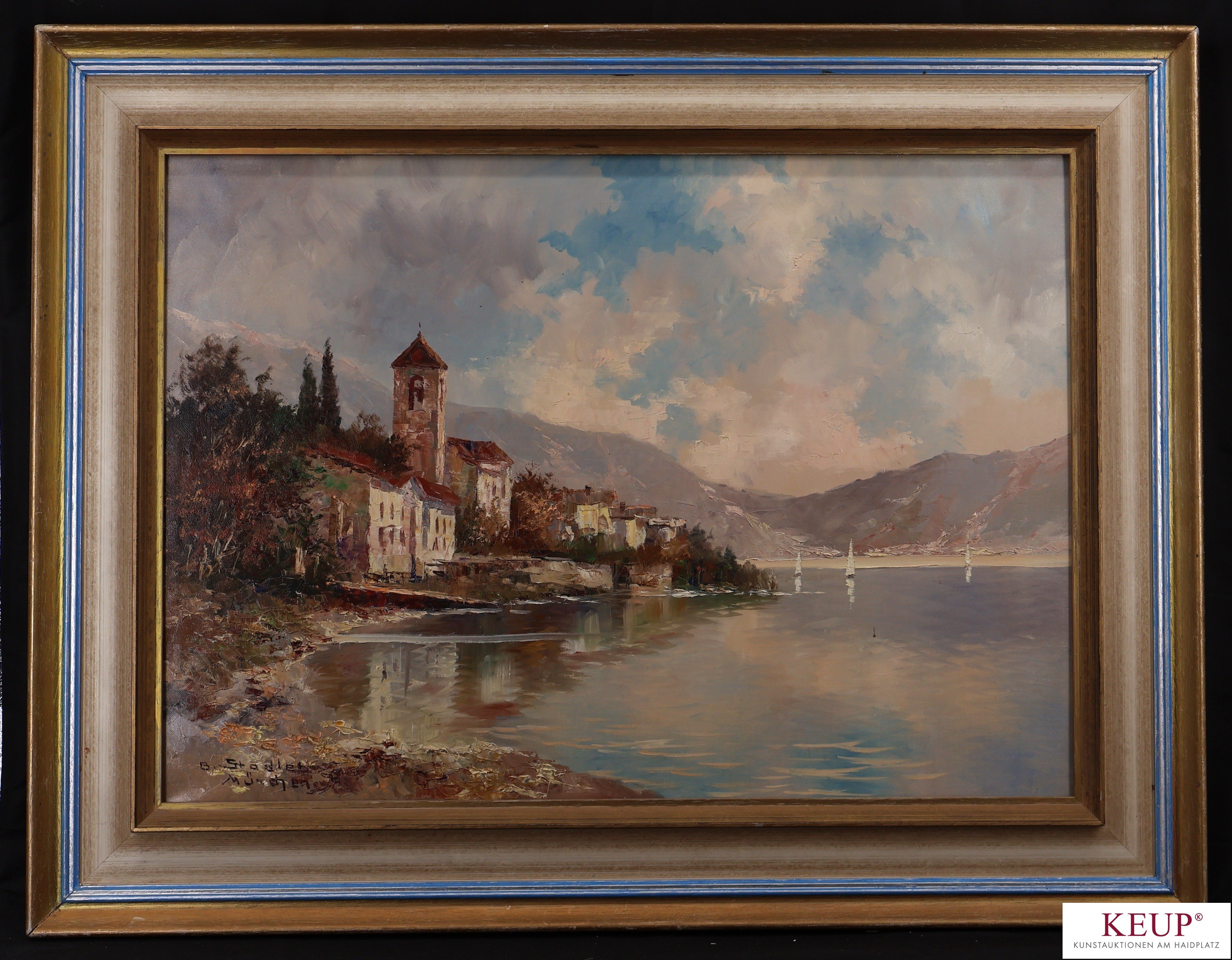 Gemälde - Benno Stadler (1908 München - 1984 München) ''Ansicht vom Gardasee'', l.u. signiert und bez. München, Öl auf Leinwand, Maße Darstellung ca. 50 x 70 cm, Rahmen, Gesamtmaße ca. 68x88 cm, Provenienz: Regensburg, vgl. Lit.: Deutscher Landschaftsmaler, tätig in München, von 1923-26 Schüler der Kunstgewerbeschule München sowie Weiterbildung bei Prof. Toni Roth. Der Künstler unternahm Studienreisen nach Italien, Frankreich, Spanien, England und Schweden. Er verwandte auch das Pseudonym ''Nilsen''.