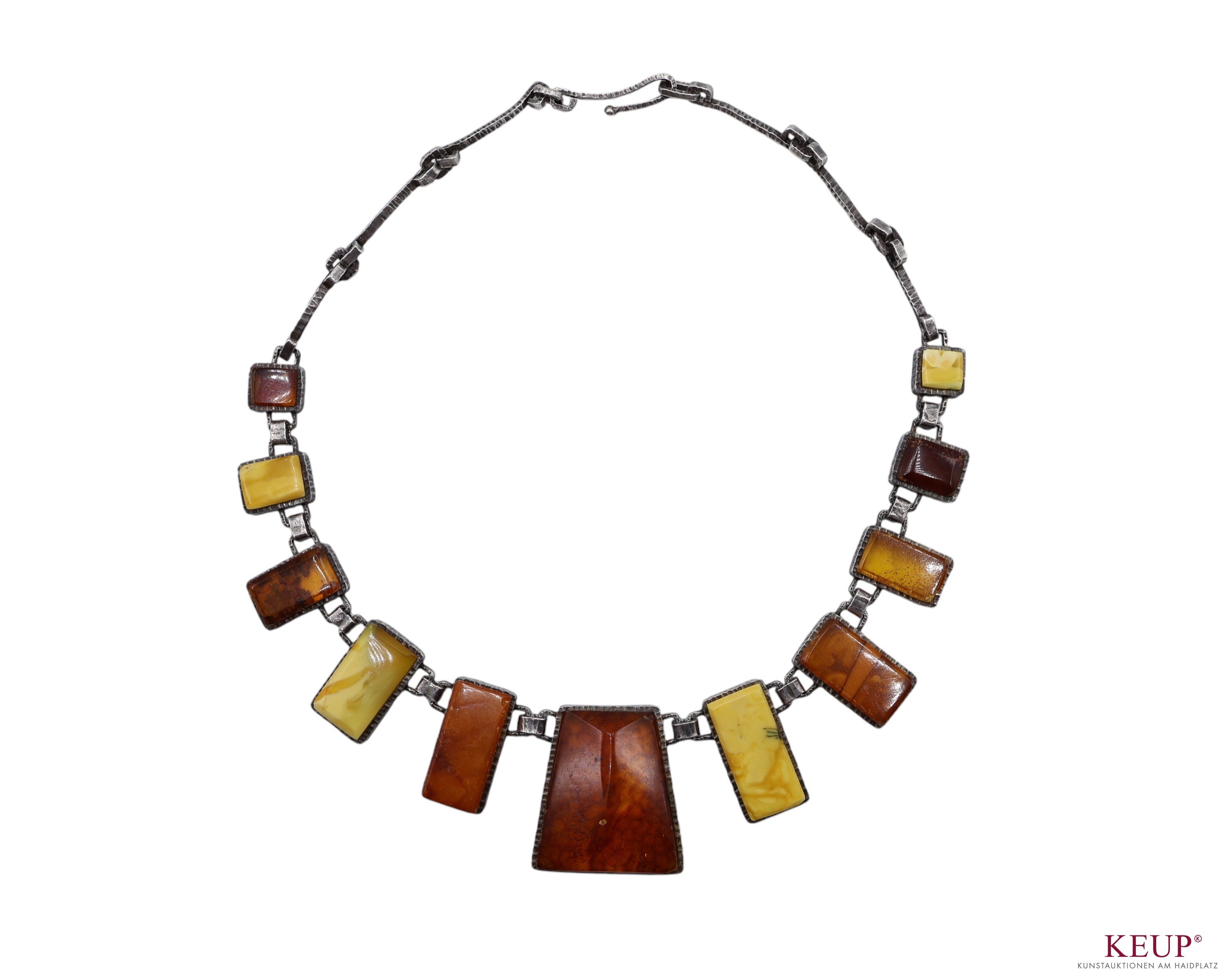 Collier - Polen XX.Jahrhundert Silber, mehrfach punziert, mit elf Bernsteinen in verschiedenen Größen, Länge ca. 47 cm, Provenienz. Privatbesitz Oberbayern