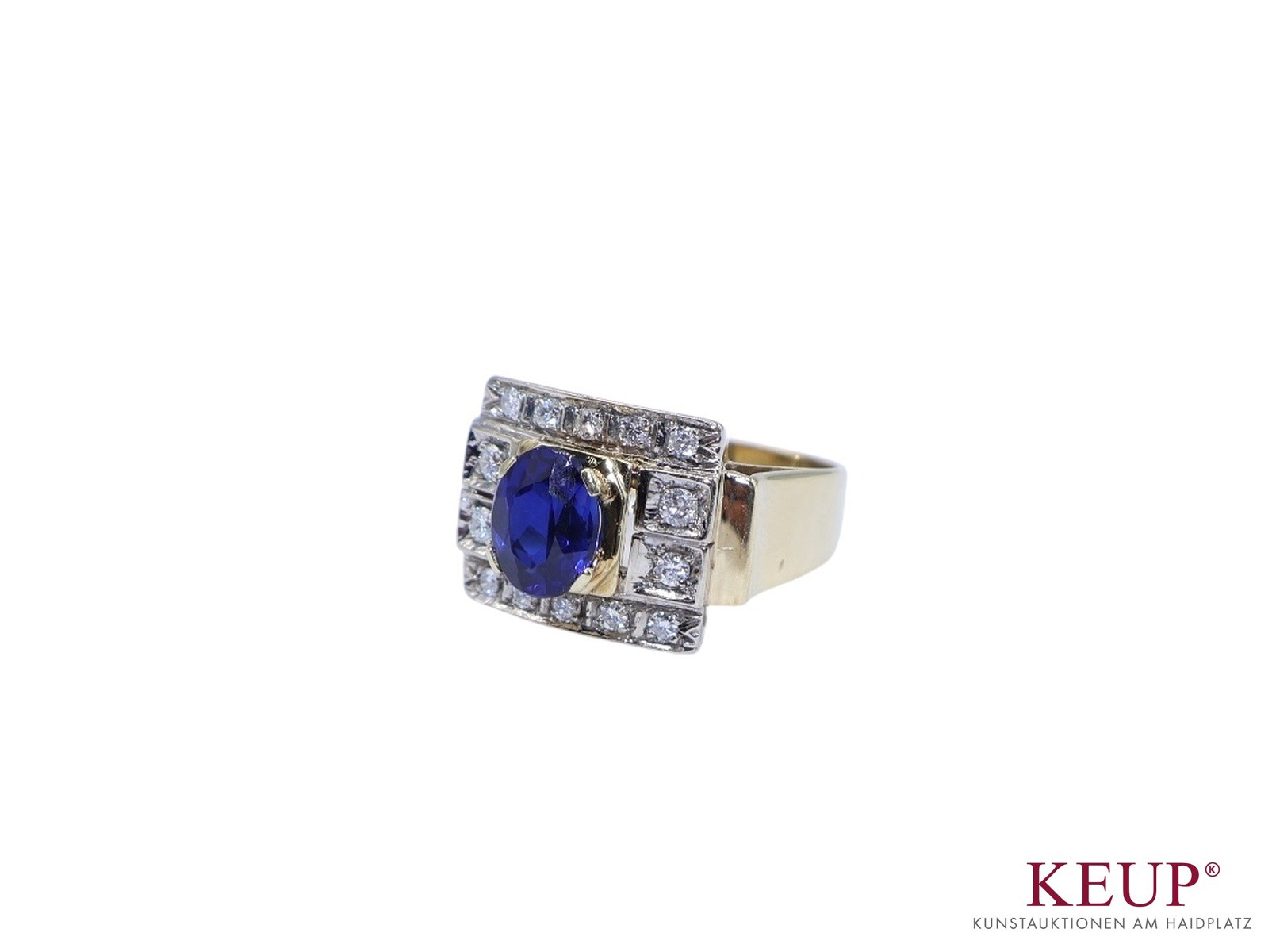 Goldener Damenring Gelbgold gest. 585, mit Saphir und 14 kl. Brillanten ausgefasst, Ringgröße 55, Provenienz: Privatbesitz Regensburg