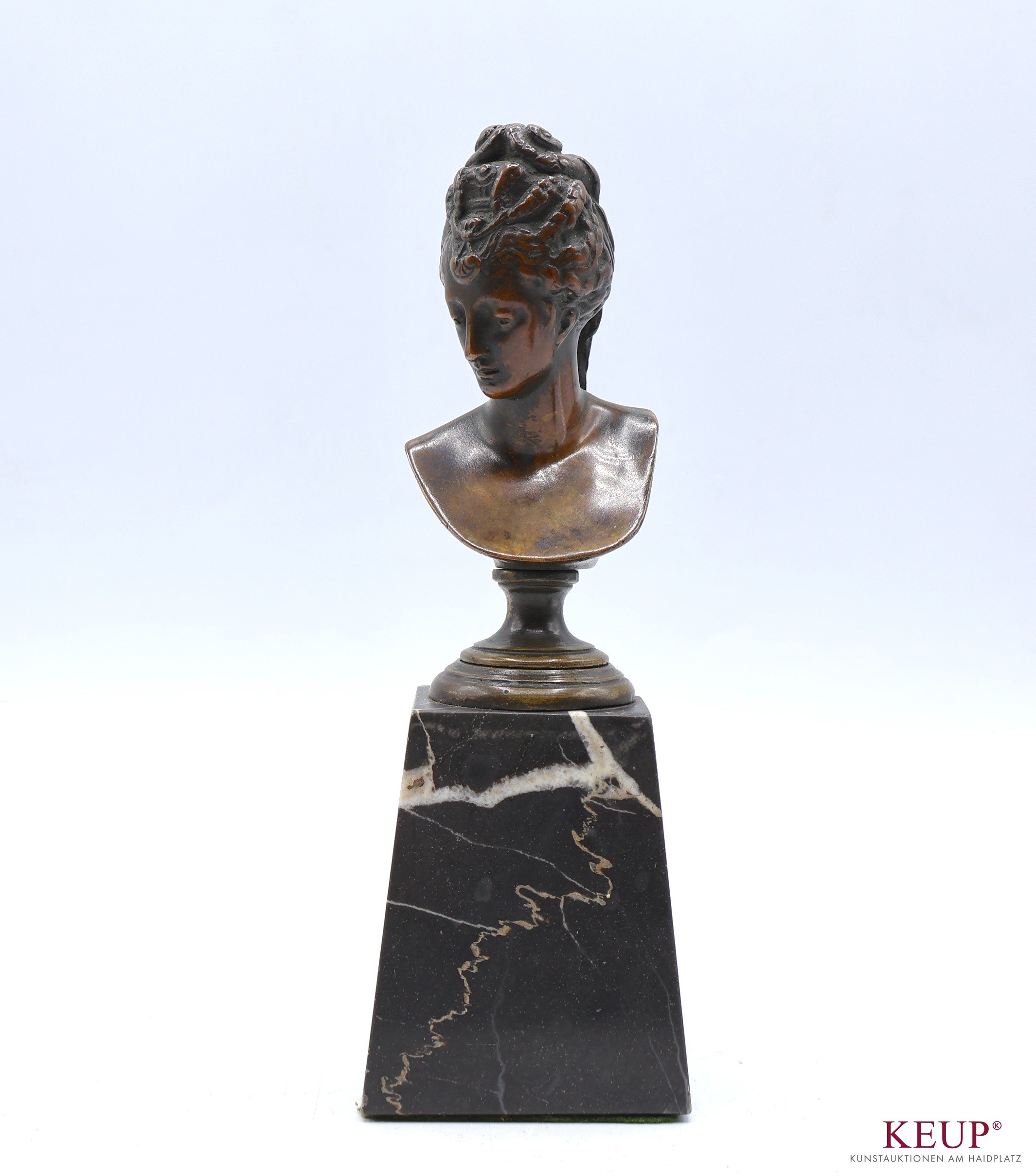 Kleine Büste - nach Vorbild Jean Goujon (1500-1566) ''Diane de Poitiers, Mätresse des Königs Heinrich II'', Bronze, Marmorsockel mit Chip, Gesamthöhe ca. 15 cm, Provenienz: Privatbesitz Niederbayern