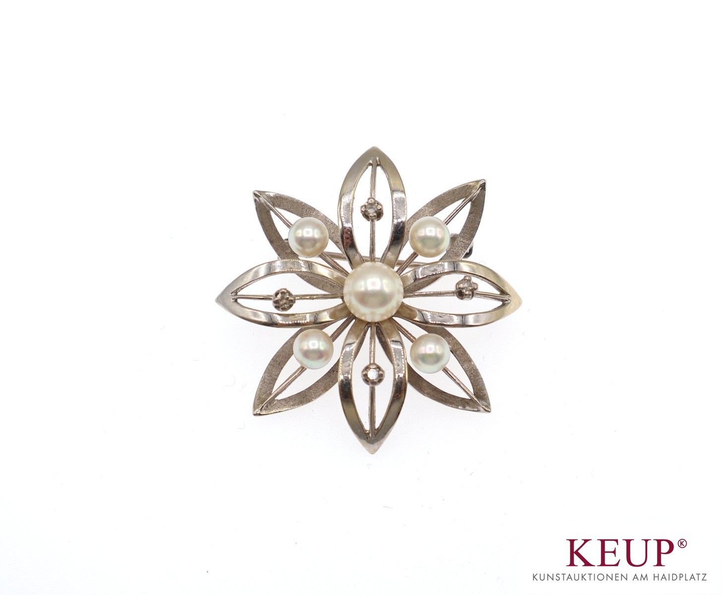 Goldene Brosche Weißgoldfassung gest. 585, Sternform, verziert mit 5 Perlen und 4 kl. Brillanten, Maße ca. 4x4 cm, ca. 7 Gramm, Provenienz: Privatbesitz Oberbayern
