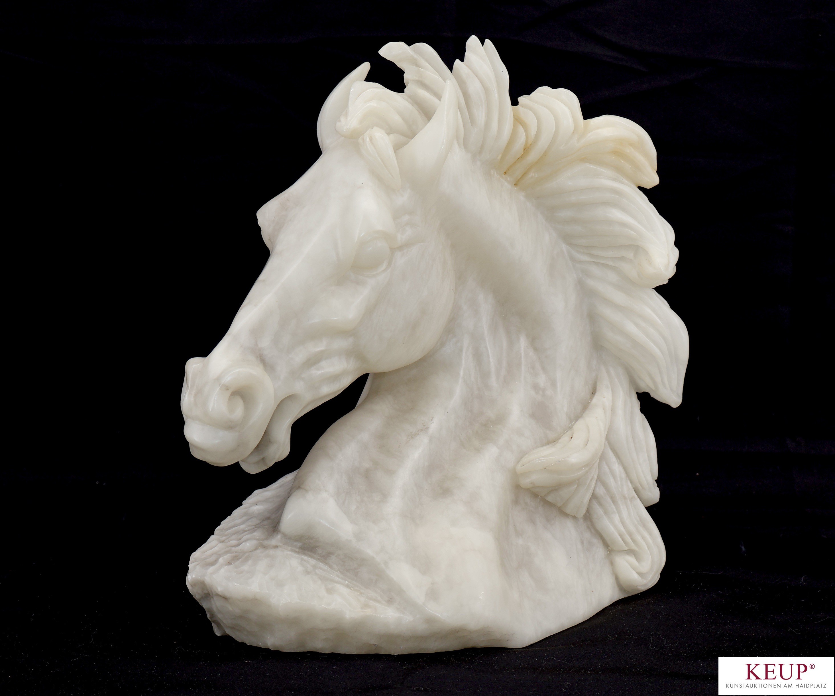 Büste - wohl Italien XX.Jahrhundert ''Pferdekopf'', unsigniert, Alabaster, schwere Ausführung, Maße ca. 33x30x20 cm, Provenienz: Privatbesitz Niederbayern