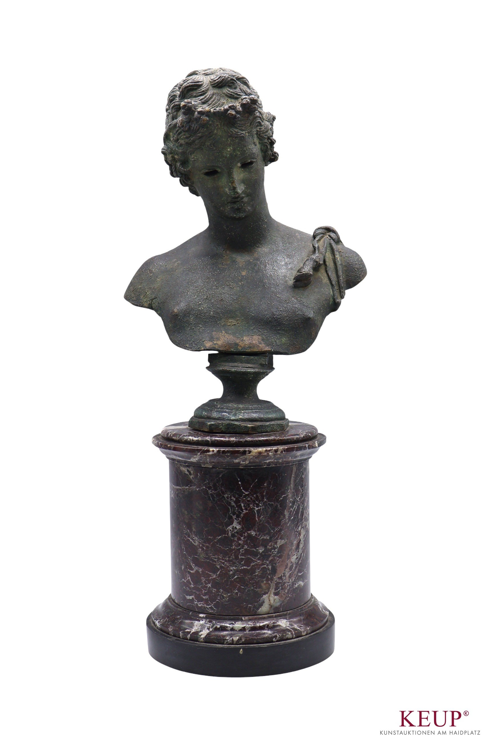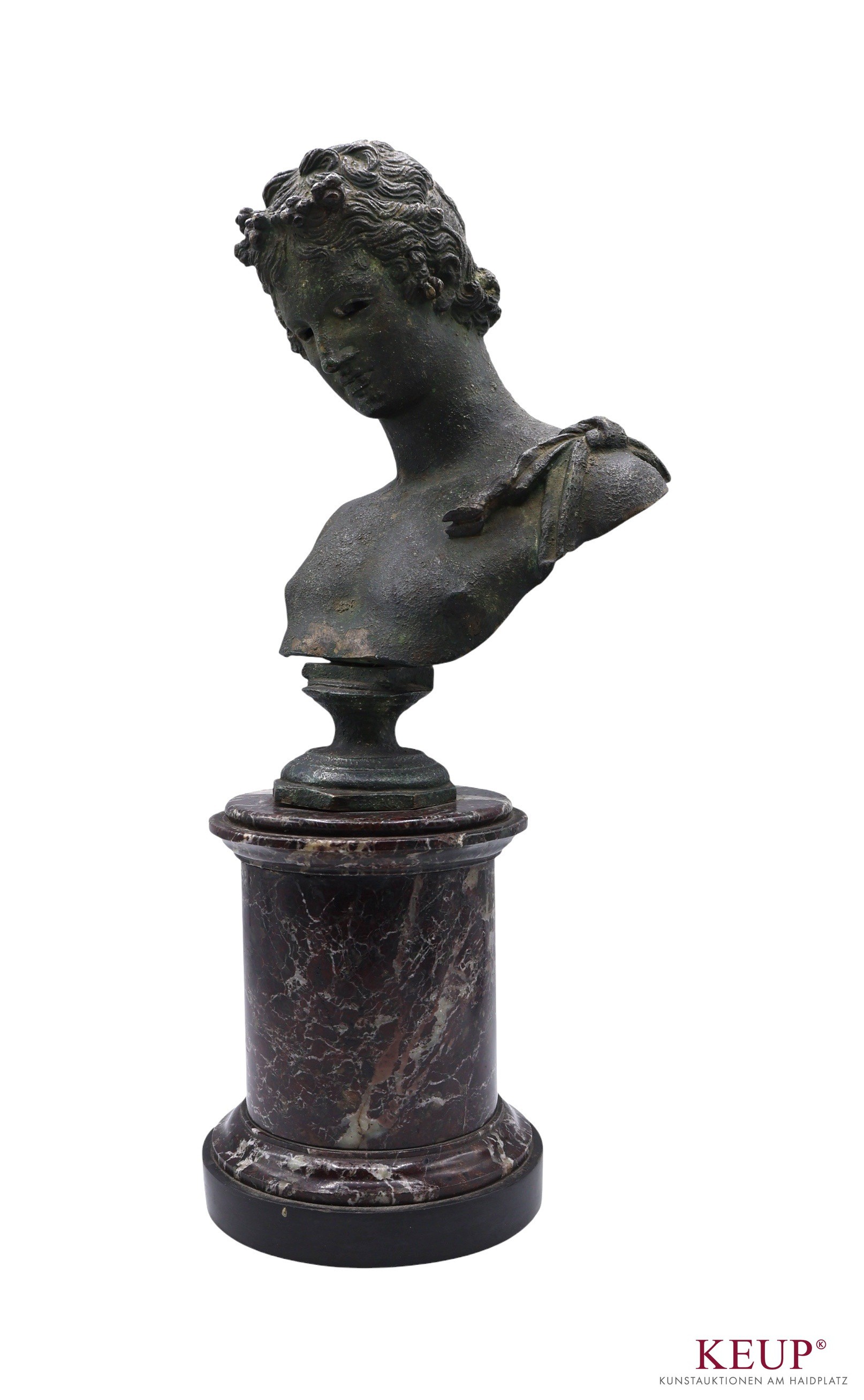 Büste nach der Antike ''Dionysos, sog. Narziss von Pompeji'', Bronze, grün patiniert, wohl Italien 19./20.Jahrhundert, Marmorsockel (Chips), Gesamthöhe ca. 35 cm, ca. 3230 Gramm, Provenienz: Privatbesitz Oberbayern