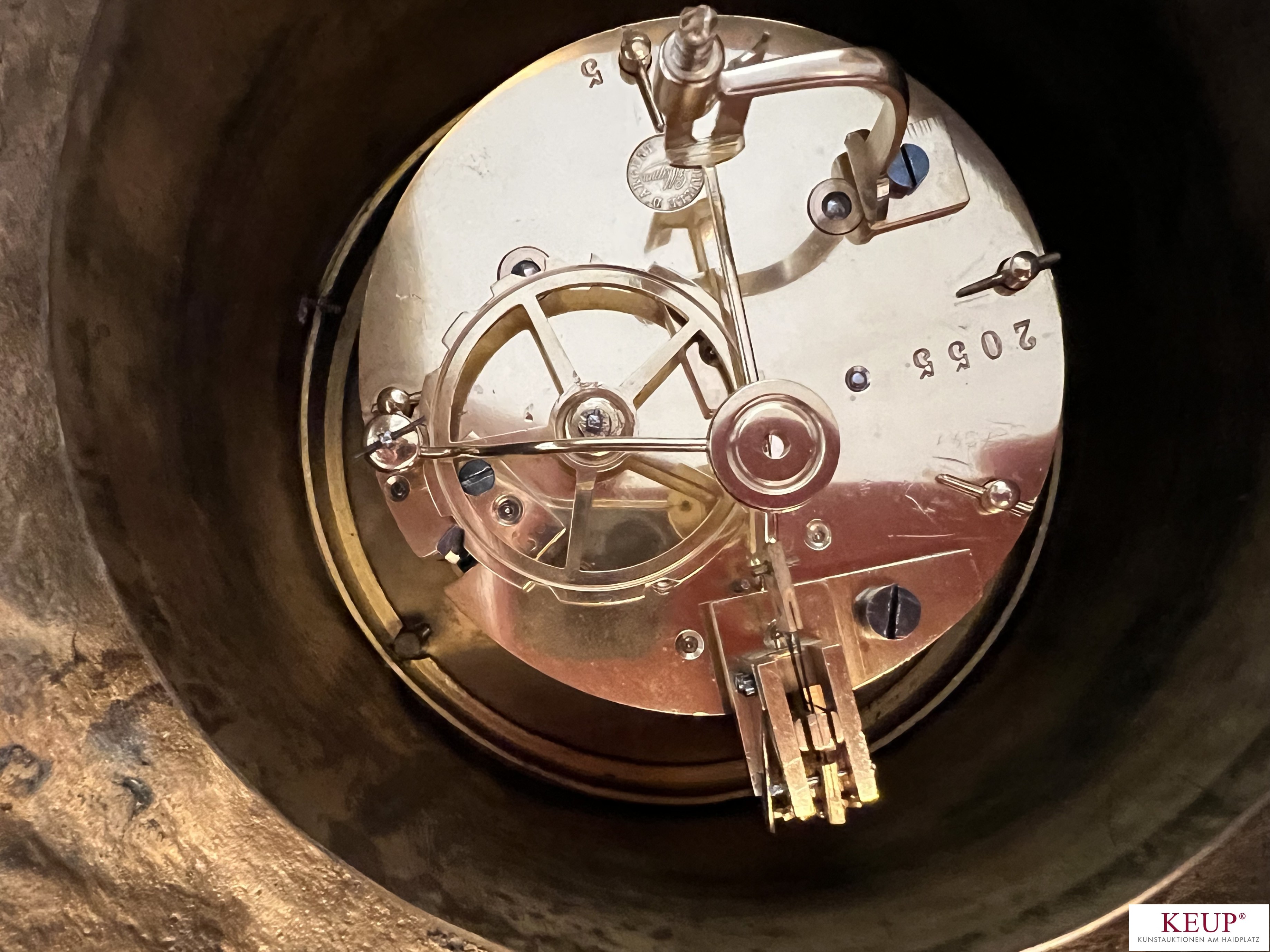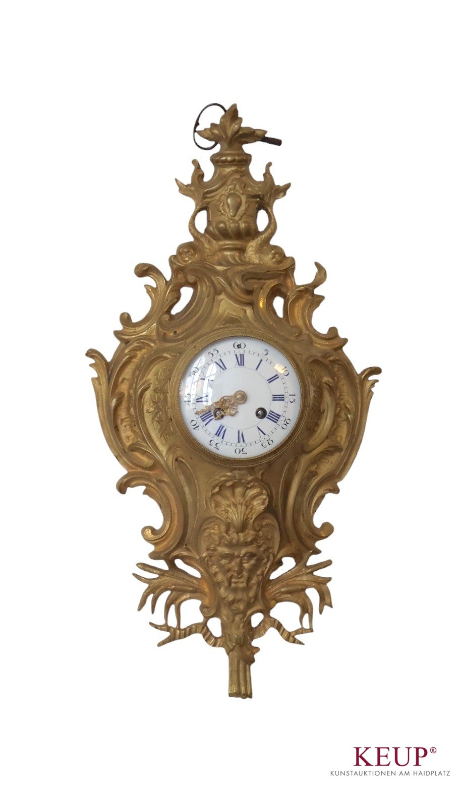 Carteluhr - wohl Frankreich um 1900 im Stil des 18.Jahrhunderts, Bronze, Front reich verziert mit Rocaillen und Maskaron, mechanisches Werk mit Schlüsselaufzug, Werk gemarkt: Medaille D´Argent G(eorges) Megnin, Nr. 2055, Schlag auf Glocke, Uhren werden nicht auf Gangbarkeit geprüft, Maße ca. 58x29 cm, Provenienz: Privatbesitz Landkreis Regensburg