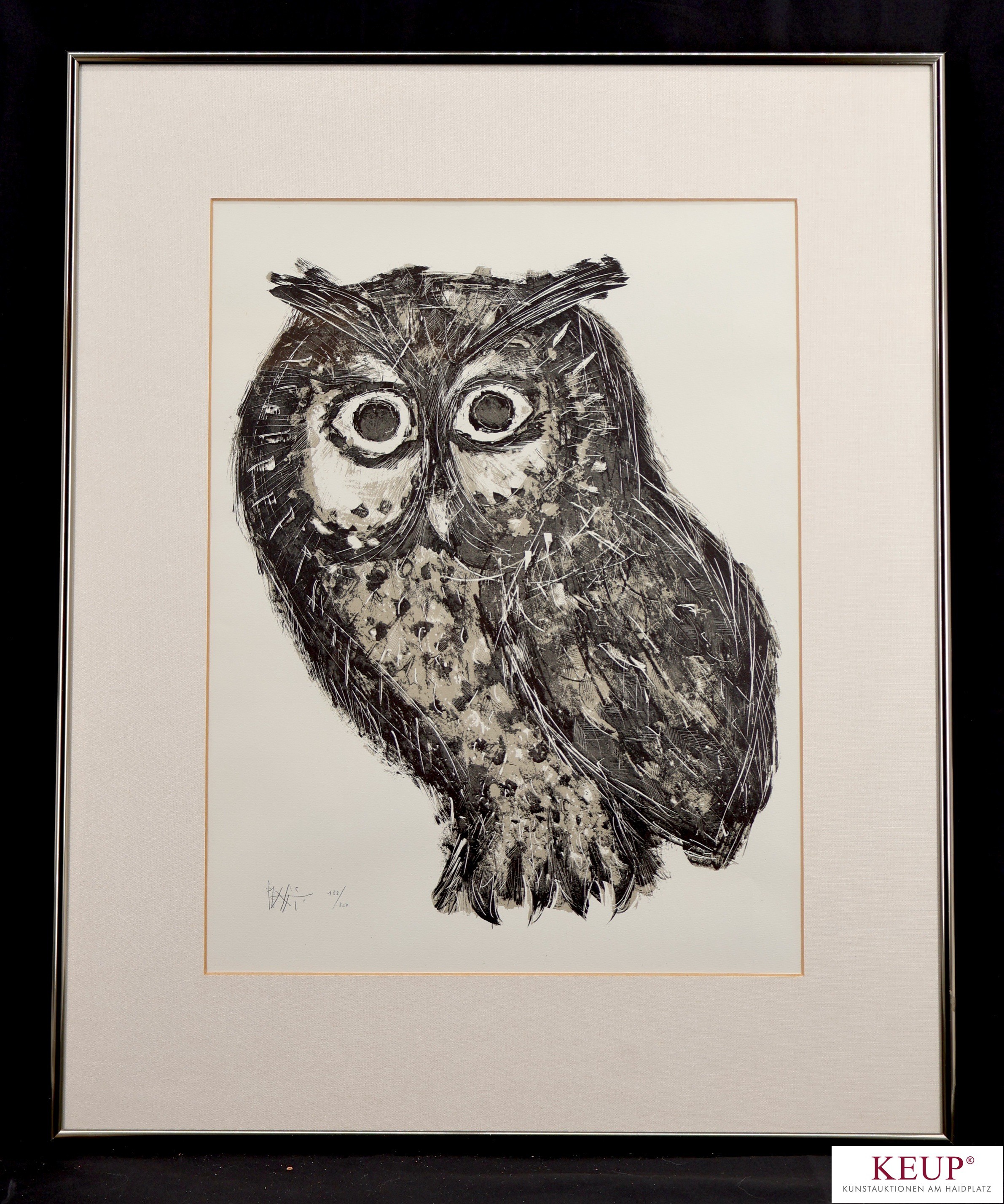 Lithographie - Celestino PIATTI (1922 Wangen Kanton Zürich -2007 Duggingen Kanton Basel-Landschaft) ''Eule'', Bleistiftsignatur, 133/250, Ausschnittmaße ca. 45x35 cm, Passepartout, Rahmen, Gesamtmaße ca. 65x53 cm Provenienz: Privatbesitz Regensburg, vgl. Lit.: Schweizer Maler und Grafiker; 1937 Abendkurse bei Ernst und Max Gubler an der Kunstgewerbeschule in Zürich; 1964 Arbeiten auf der documenta III in Kassel;