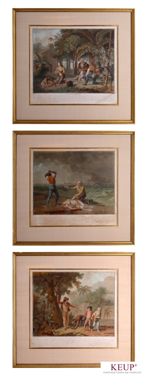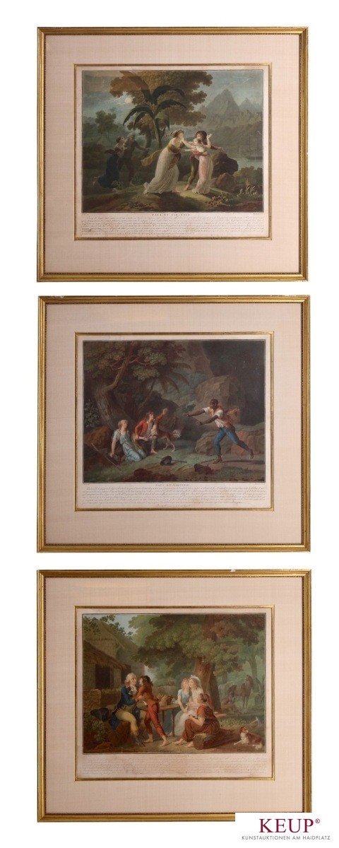 6 Radierungen - Charles Melchior DESCOURTIS (Frankreich 1753-1820) ''Paul et Virginie (c.1790)'', nach Frédéric Schall, Maße Darstellung ca. 37 x 41,5 cm, Altersspuren, Passepartout, Rahmen, Gesamtmaße ca. 57x60 cm, Provenienz: Privatbesitz Regensburg