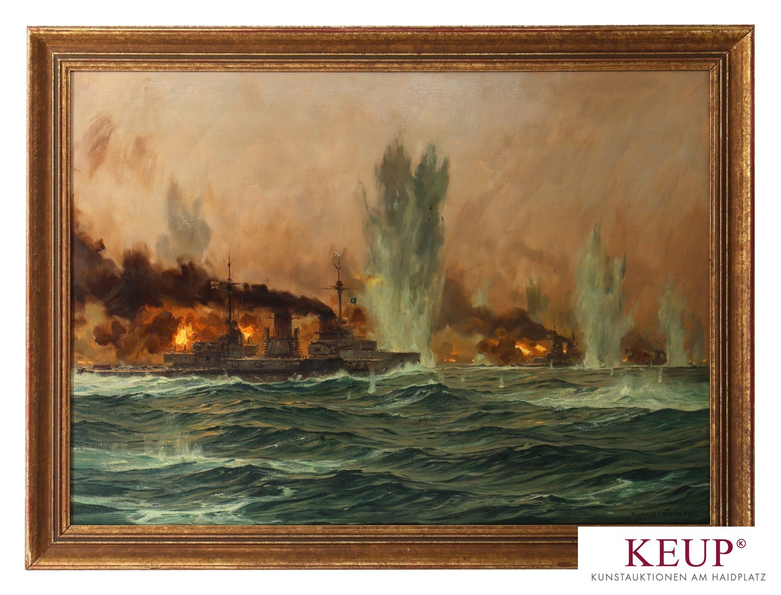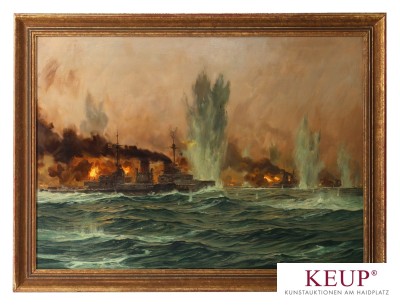 Großes Gemälde - Claus BERGEN (1885 Stuttgart - 1964 Lenggries Oberbayern) ''wohl Seeschlacht vor dem Skagerrak im Ersten Weltkrieg (zwischen der deutschen Hochseeflotte und der Grand Fleet der Royal Navy in den Gewässern vor Jütland'', r.u. signiert, Öl auf Leinwand, rückseitig Leinwandstempel A. Schutzmann 1844 Prof. Dörner Malleinen, Provenienz: Privatbesitz Regensburg, Maße ca. 70x100 cm (ohne Rahmen), vgl. Lit.: deutscher Landschafts- und Marinemaler, Karl May Illustrator, Besuch des Maximiliangymnasium und künstlerische Ausbildung bei Weinhold, Strützel, Müller und Bartels; ab 1904 in der Malklasse von Professor Carl von Marr an der Akademie der Bildenden Künste in München;