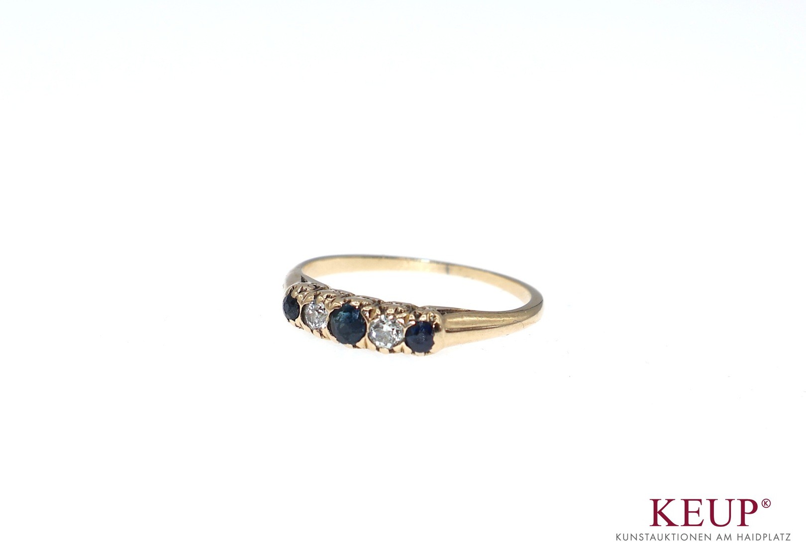 Damenring Gelbgold gest. 585, verziert mit 3 kl. Saphiren und 2 kl. Diamanten, Ringgröße 53, ca. 2 Gramm, Provenienz: Privatbesitz Oberbayern