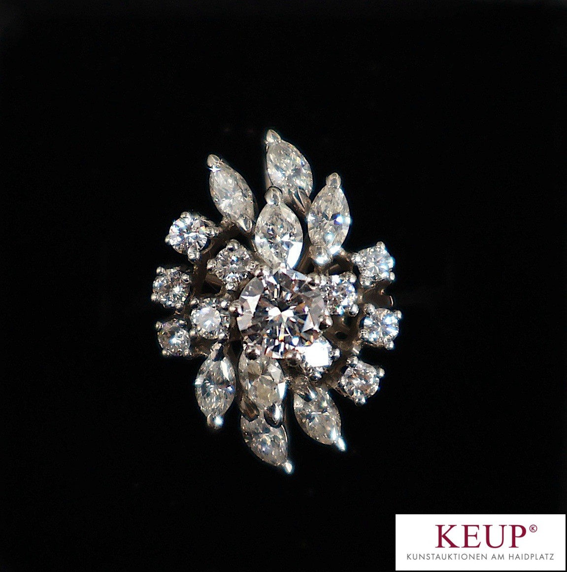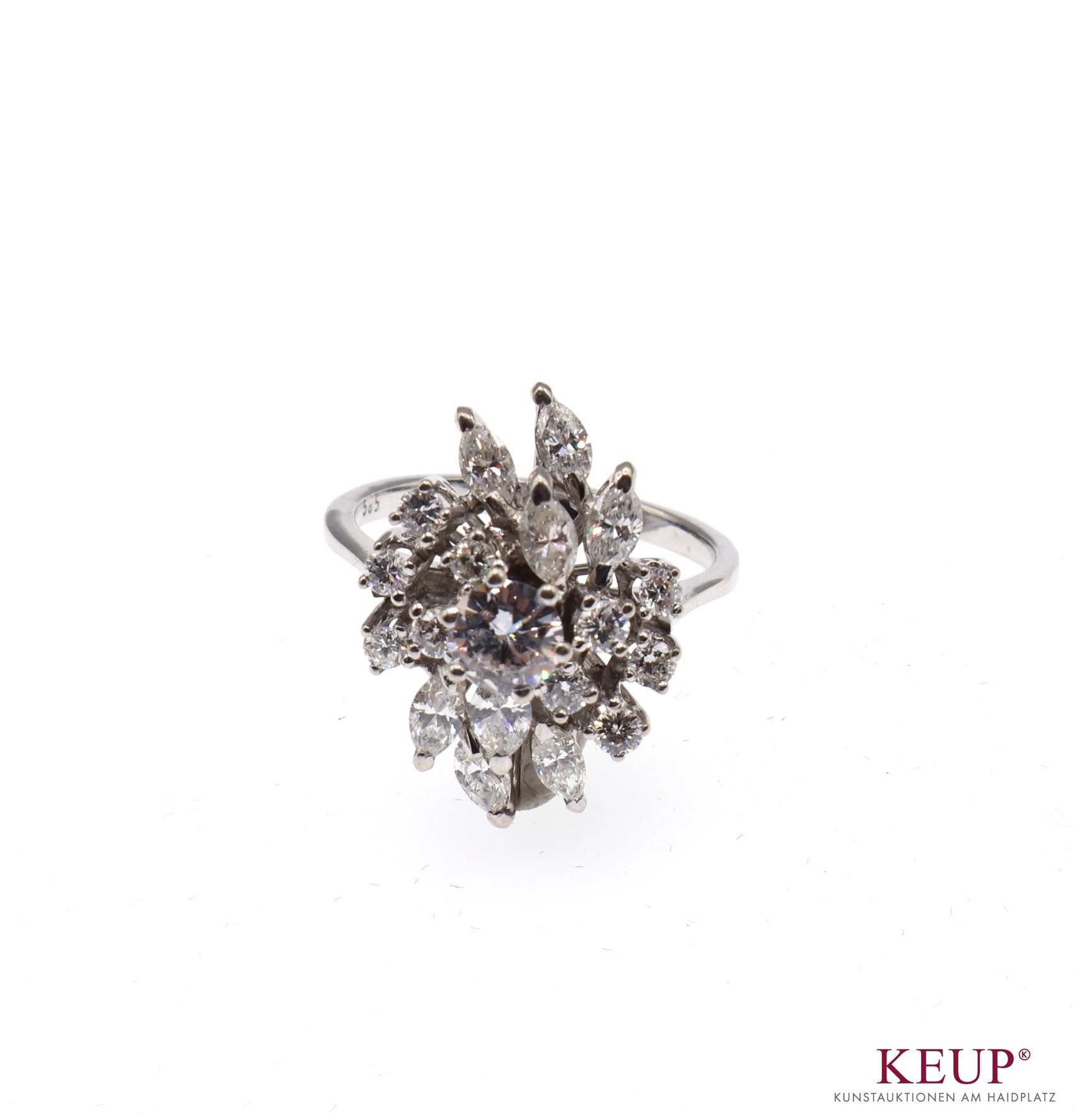 Goldener Damenring Blütenform reich dekoriert mit einem Solitärbrillanten umrandet von Marquise-förmigen und runden Brillanten, Weißgold gest. 585, Ringgröße 55, ca. 5 Gramm, Provenienz: Privatbesitz Landkreis Regensburg