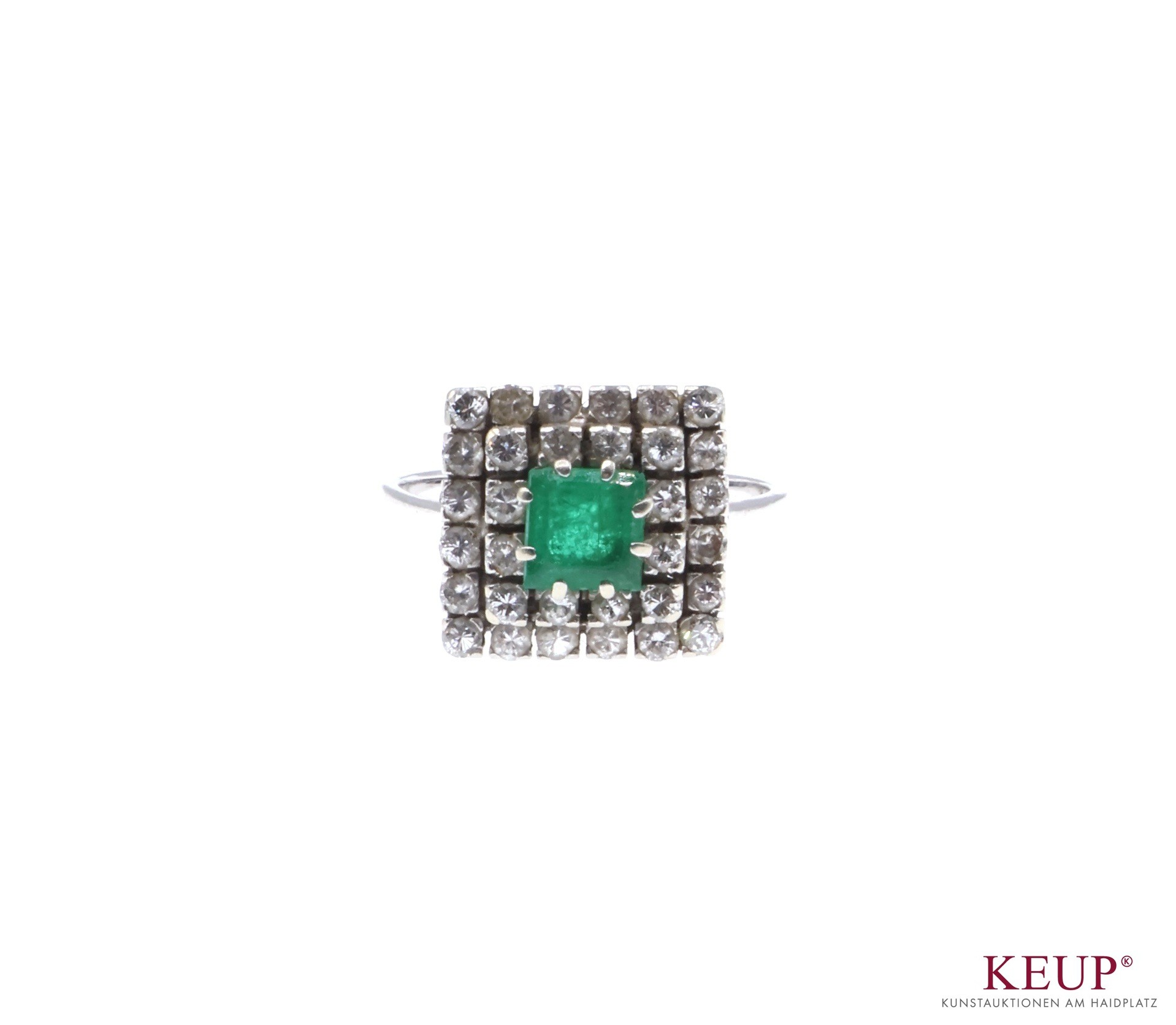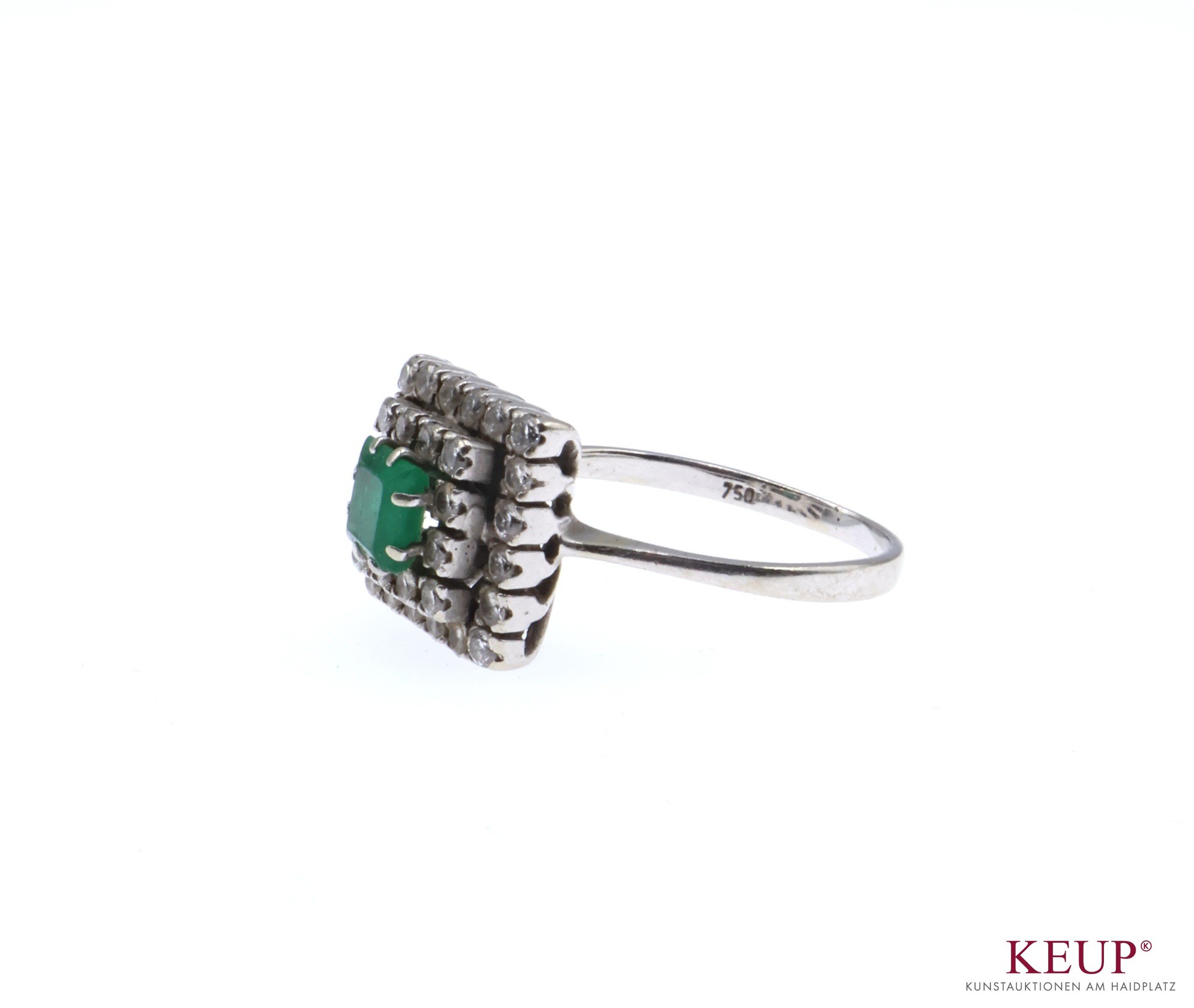 Goldener Damenring Weißgold gest. 750, rechteckige Form, zentral mit einem Smaragden verziert und mit 32 kl. Brillanten ausgefasst, Ringgröße 56, ca. 4,5 Gr., Provenienz: Privatbesitz Chiemgau