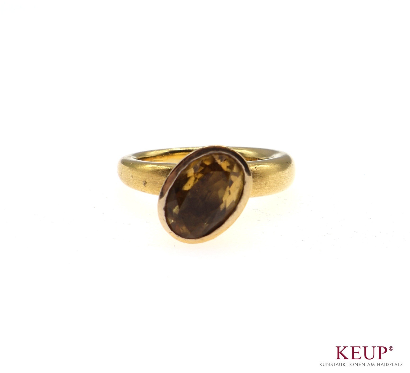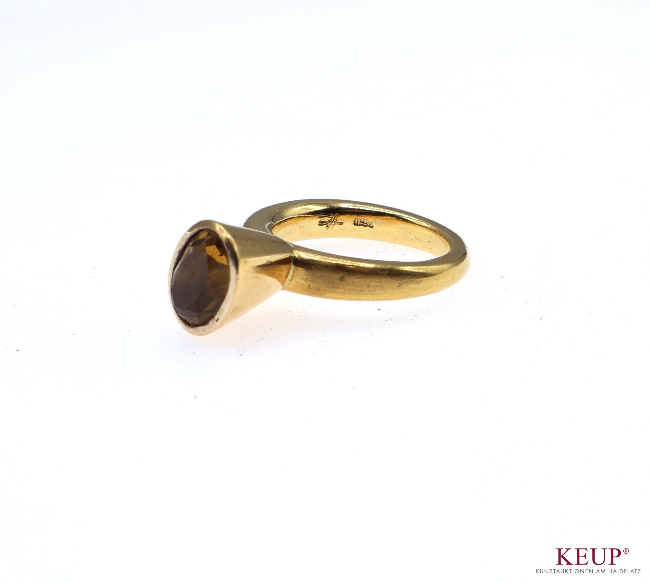 Goldener Damenring Goldschmiedearbeit von Heike Crusius, Gelbgold gest. 750, mit gelbem Schmuckstein ausgefasst, Ringgröße 53, ca. 11,9 Gramm, Provenienz: Privatbesitz Landkreis Regensburg
