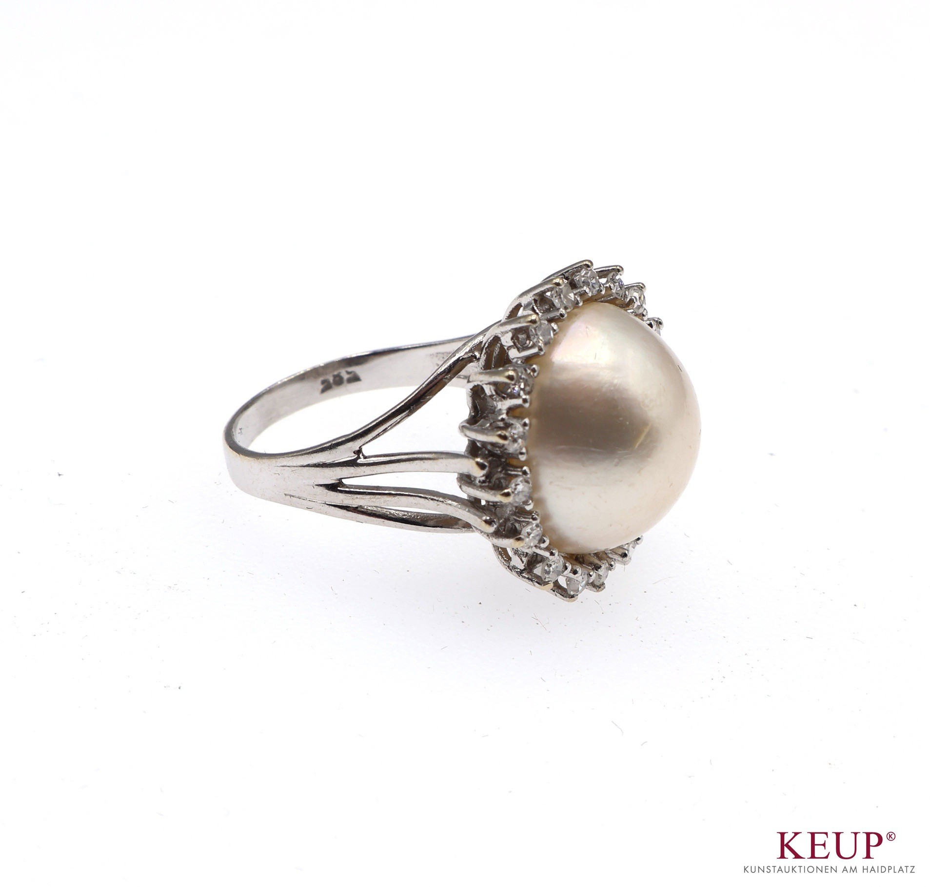 Goldener Damenring reich dekoriert mit einer Mabé-Perle umrandet von kl. Brillanten, Weißgold-Fassung gest. 585, Ringgröße ca. 55, Gebrauchsspuren, ca. 7,13 Gramm, Provenienz: Landkreis Regensburg