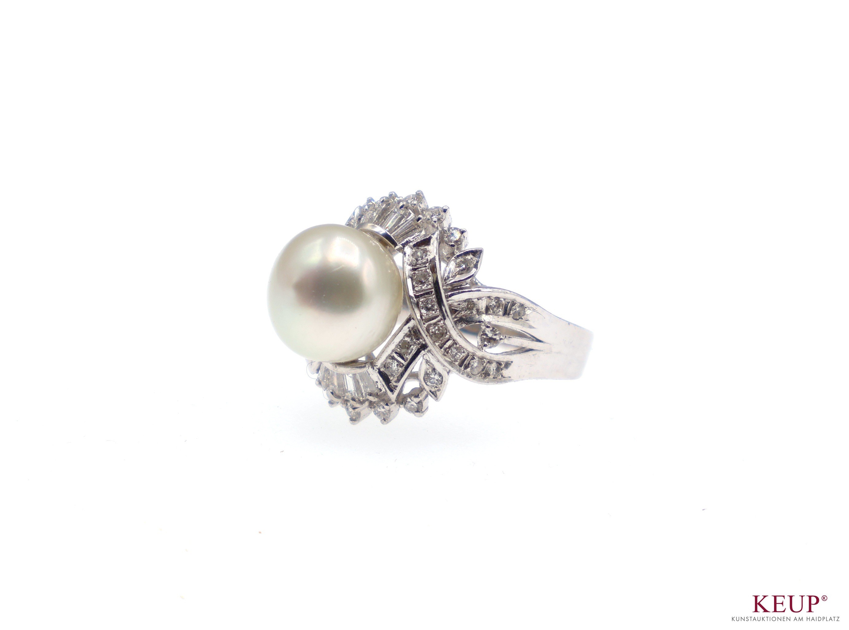 Prunkvoller Damenring Weißgoldfassung gest. 14 K und 585, dekoriert mit großer Perle (ca. 11 mm) umrandet von ca. 40 kleinen Brillanten und Brillantbaguettes, Ringgröße 57, 10,5 Gramm, Provenienz: Privatbesitz Oberbayern
