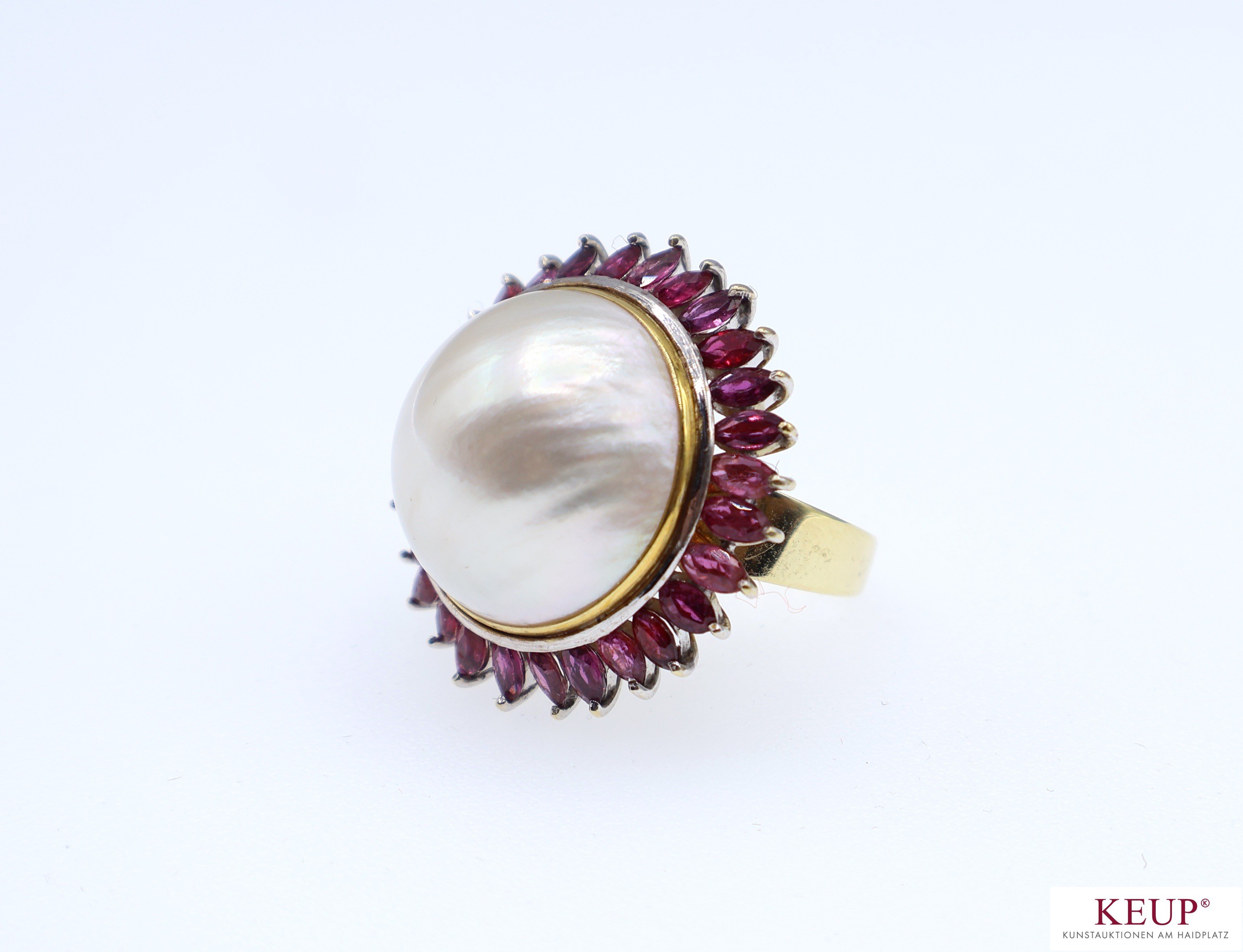 Goldener Ring - Gelbgold gest. 585 mit großer Mabeperle (Durchmesser 19 mm) und einem Sternring aus ca. 28 Rubinnavetten, Durchmesser 27 mm, Ringgröße 51, ca. 13 Gramm, Provenienz: Privatbesitz Landkreis Regenburg