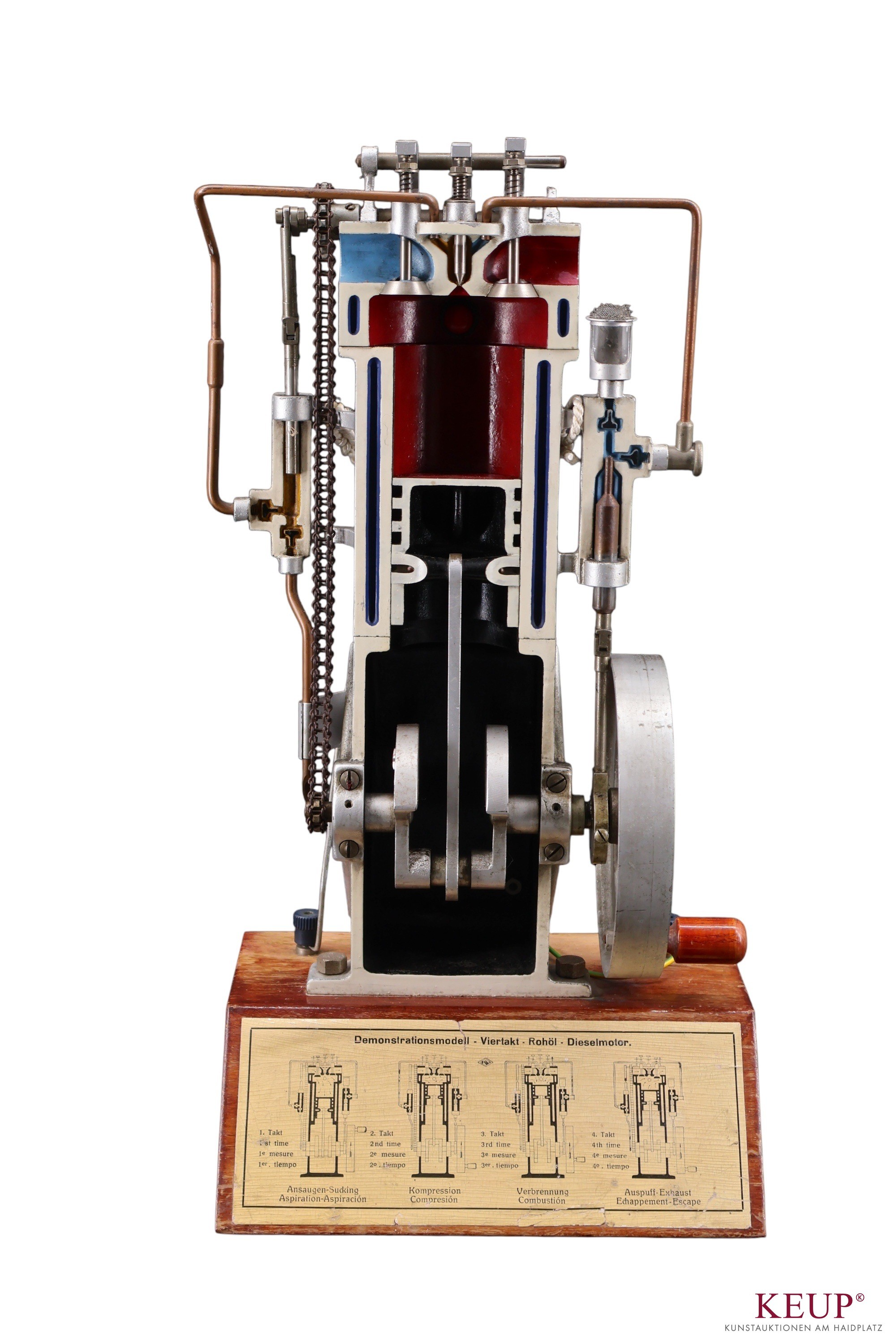 Demonstrationsmodell - XX.Jahrhundert rückseitig gemarkt: ''Raute mit KV'', ''Viertakt-Rohöl-Dieselmotor'', abgeschrägter Holzsockel mit Anleitung, Höhe ca. 46 cm, Provenienz: Privatbesitz Landkreis Regensburg