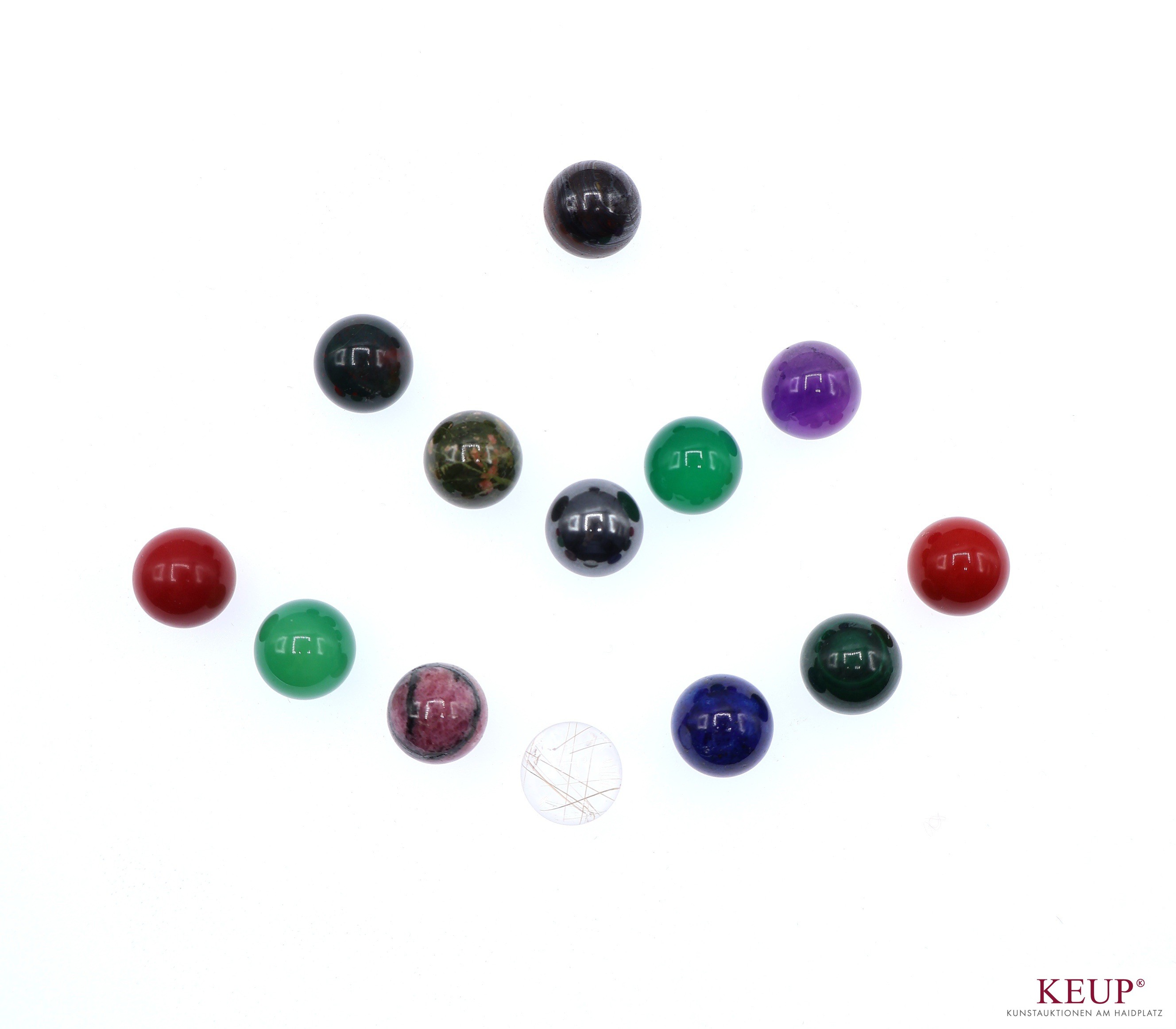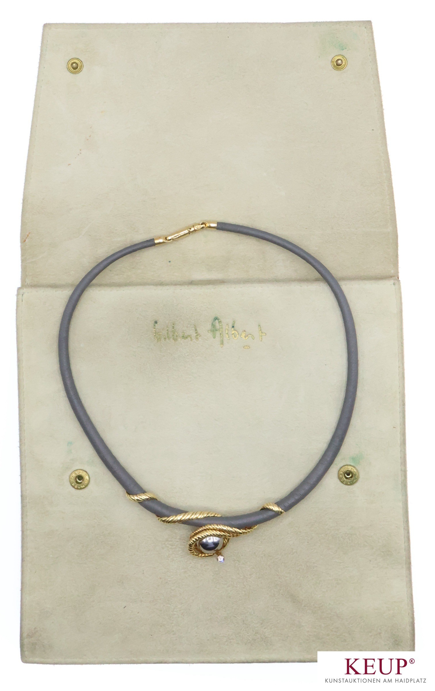 Goldener Anhänger - Design Gilbert Albert (1930-2019 Schweiz) Gelbgold gest. 750, Kleiner Brillant, gefasste Kugel, Länge ca. 74 mm, an grauem Lederreif (1 Ersatz in grün), 13 Ersatzkugeln, Provenienz: Privatbesitz Regensburg, vgl. Lit.: Eröffnete 1962 sein eigenes Atelier; Die Marke betreibt Boutiquen in Genf, Zürich, Moskau, Paris und New York; Auszeichnung bei den Diamonds International Awards