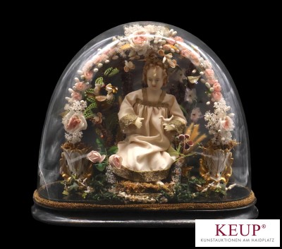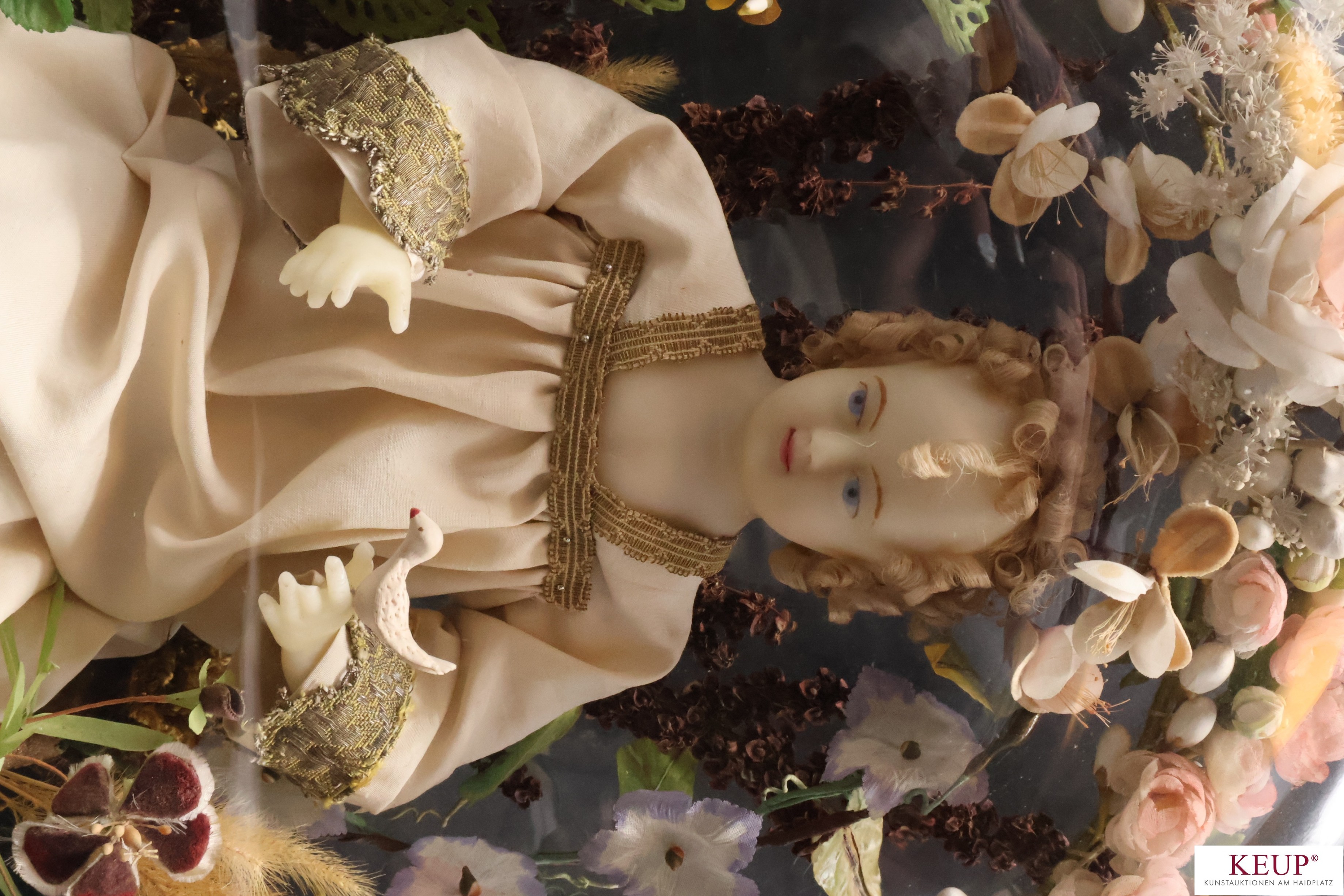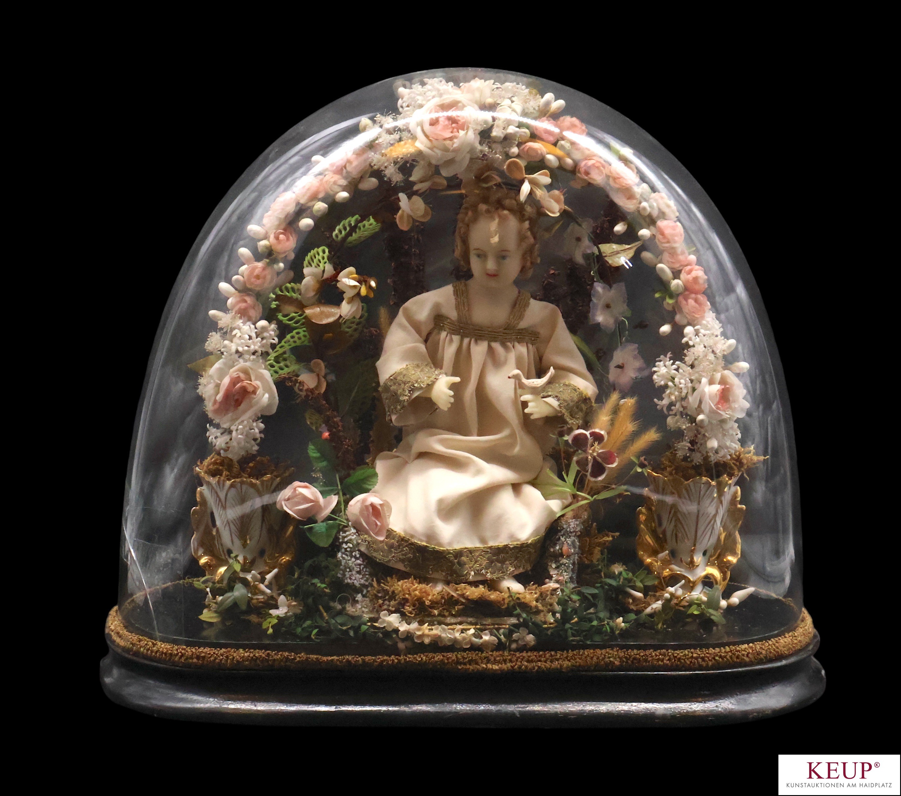 Eingericht - wohl Alpenland Ende 19.Jahrhundert Wachskind flankiert von floralem Dekor, Glassturz auf schwarzem Holzsockel (Glas an der linken unteren Seite gebrochen), Maße ca. 44x50x22 cm, Provenienz: Privatbesitz Niederbayern