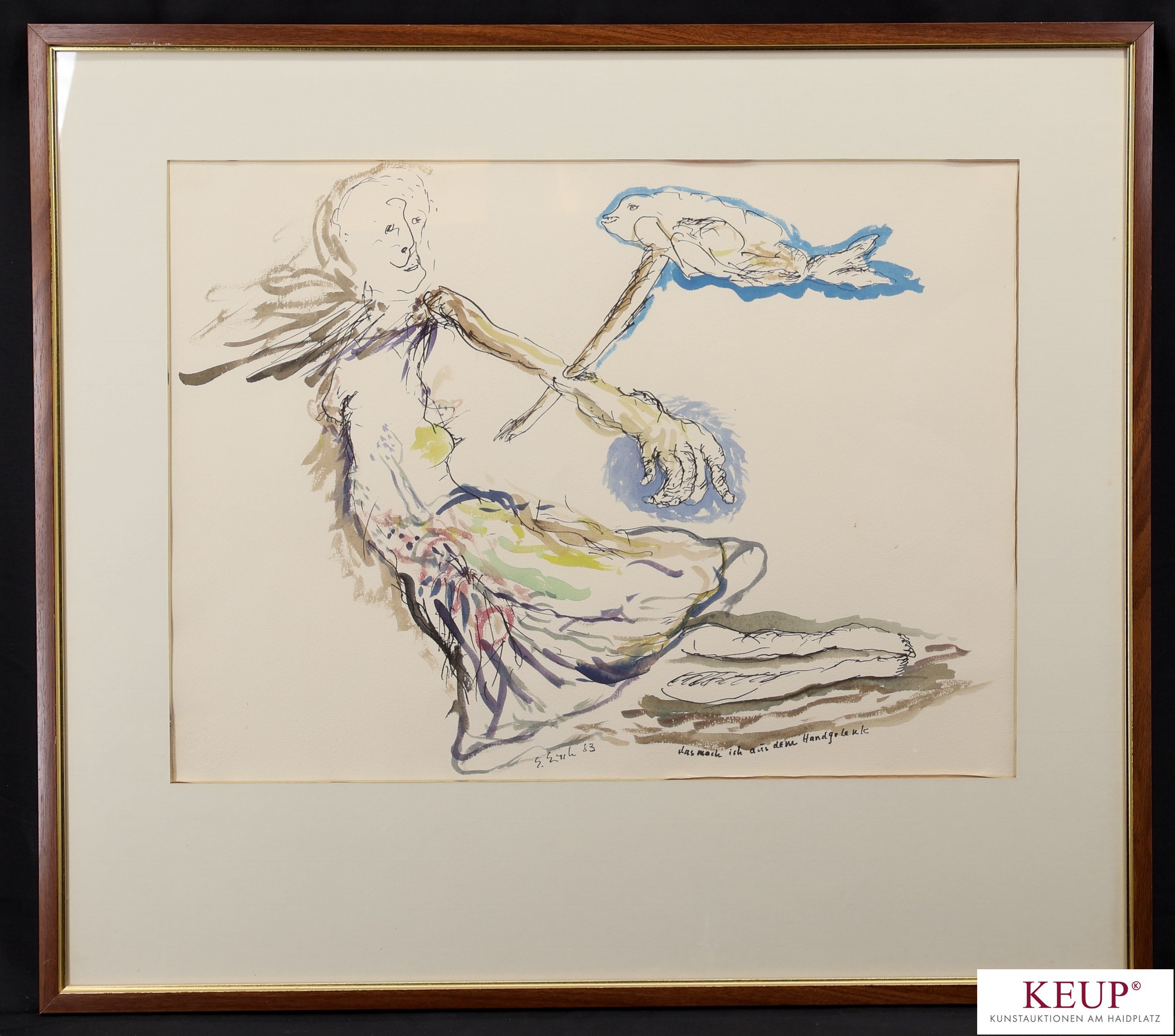 Zeichnung/Aquarell - Erwin Eisch (1927 Frauenau - 2022 Zwiesel) ''das mach ich aus dem Handgelenk'', unten Mitte signiert und datiert 83, lasierende Farben/ Stift auf Papier, Maße ca. 38x52 cm, Passepartout, Rahmen, Gesamtmaße ca. 60x68 cm, Provenienz: Private Kunstsammlung Oberpfalz, vgl. Lit.: deutscher Glaskünstler, Studium an der Akademie der Bildenden Künste München, Gründungsmitglied der Künstlergruppe ''Spur''. 1960 Mitbegründer der Künstlergruppe ''Radama''