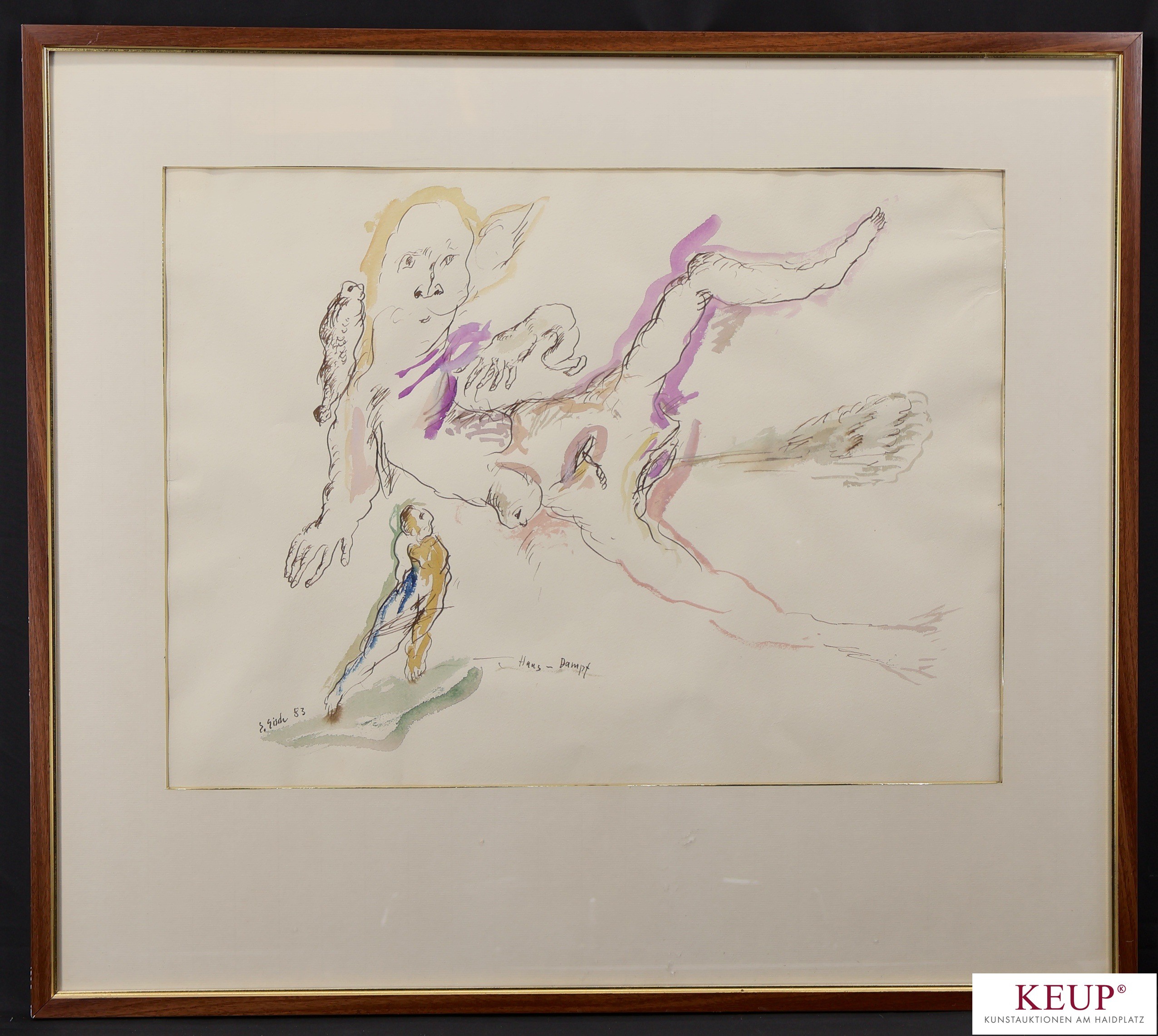 Zeichnung/Aquarell - Erwin Eisch (1927 Frauenau - 2022 Zwiesel) ''Hans-Dampf'', signiert und datiert 83, lasierende Farben/ Stift auf Papier, Maße ca. 38x52 cm, Passepartout, Rahmen, Gesamtmaße ca. 60x68 cm, Provenienz: Private Kunstsammlung Oberpfalz, vgl. Lit.: deutscher Glaskünstler, Studium an der Akademie der Bildenden Künste München, Gründungsmitglied der Künstlergruppe ''Spur''. 1960 Mitbegründer der Künstlergruppe ''Radama''