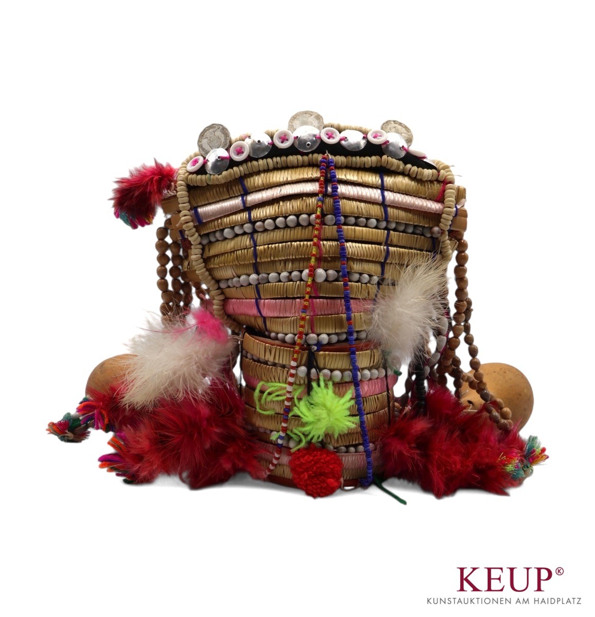 Frauenkopfschmuck - wohl Nord Thailand verziert mit bunten Federn, Kalebassen, Münzen, Bast, etc., Provenienz: Privatsammlung Regensburg