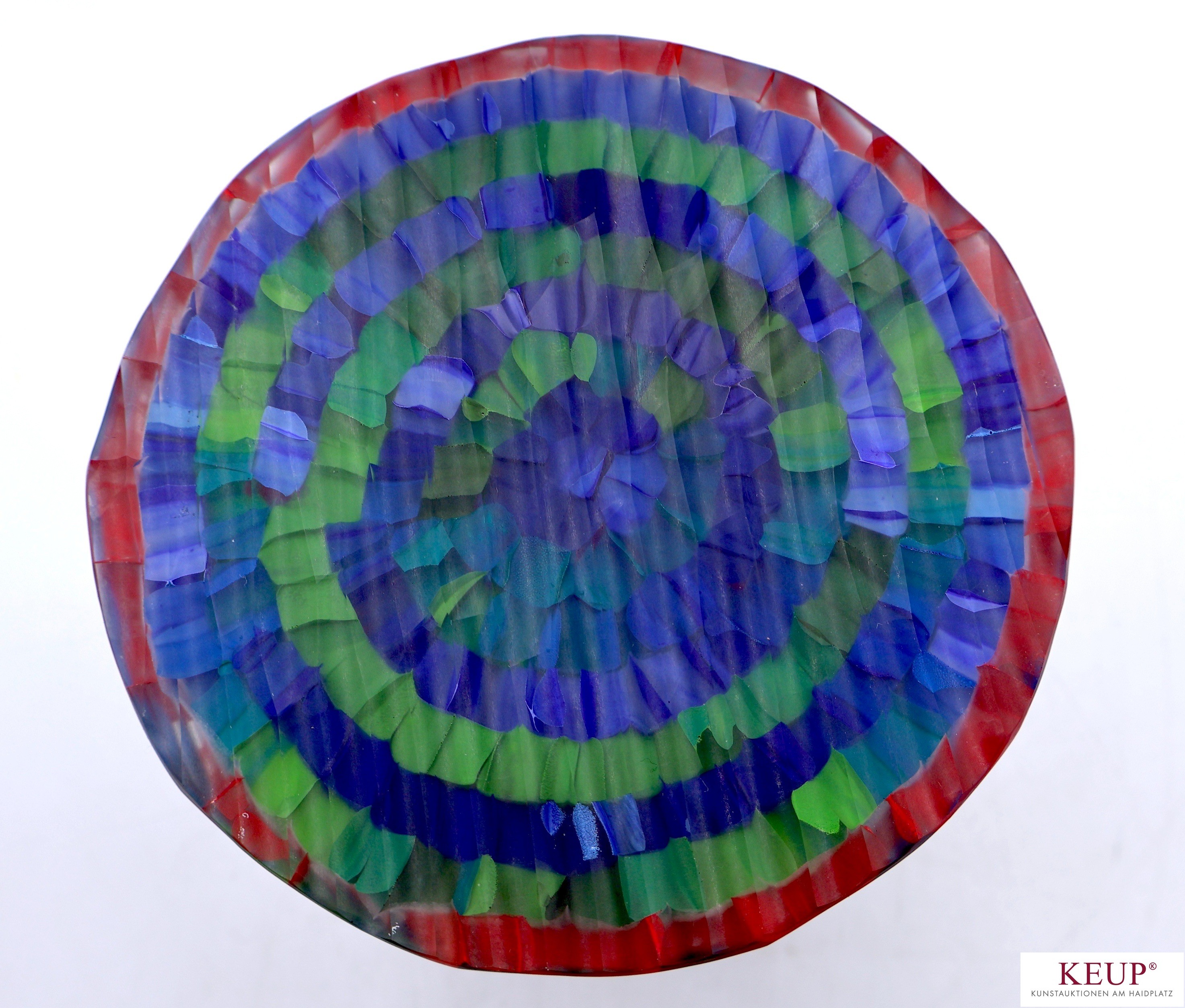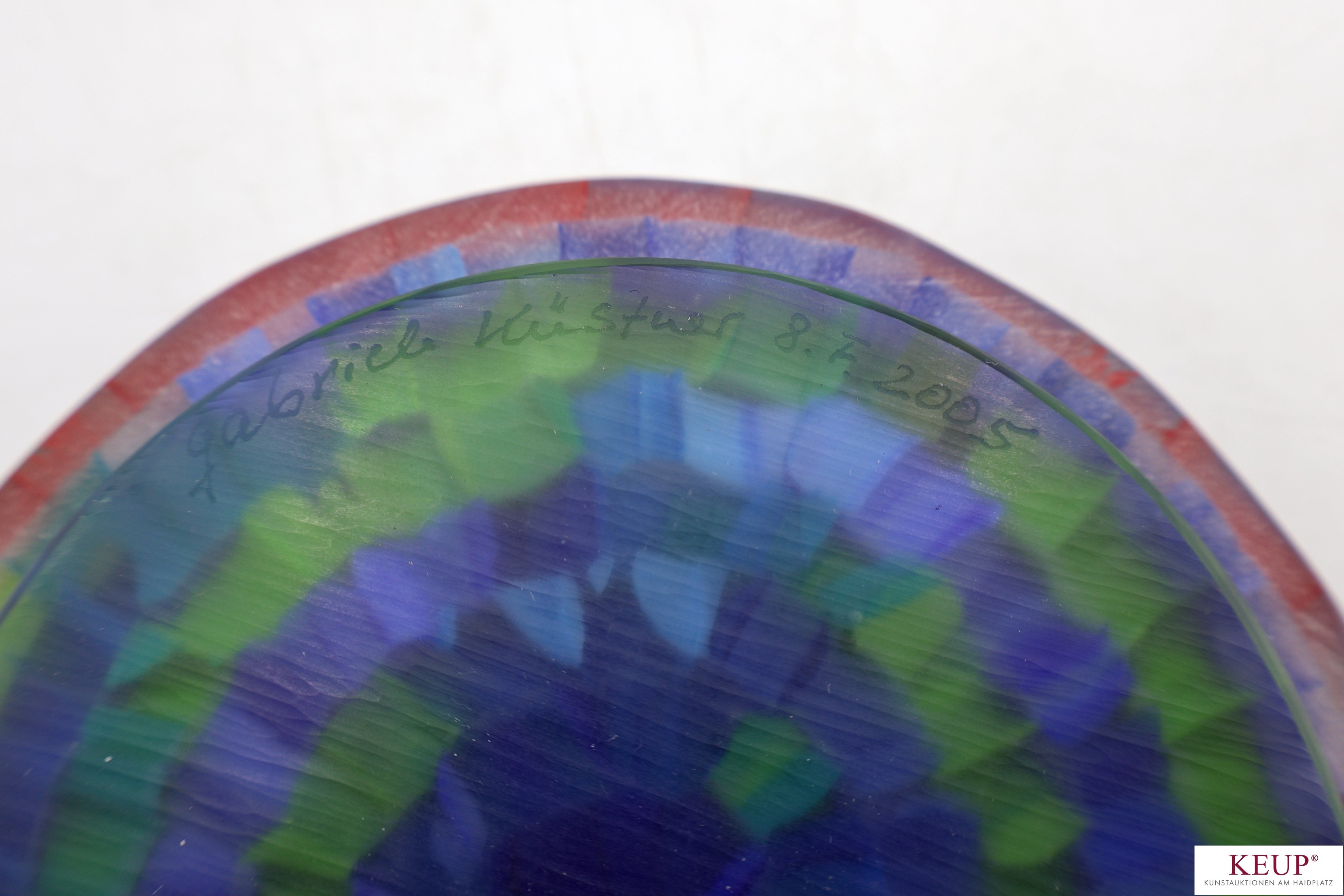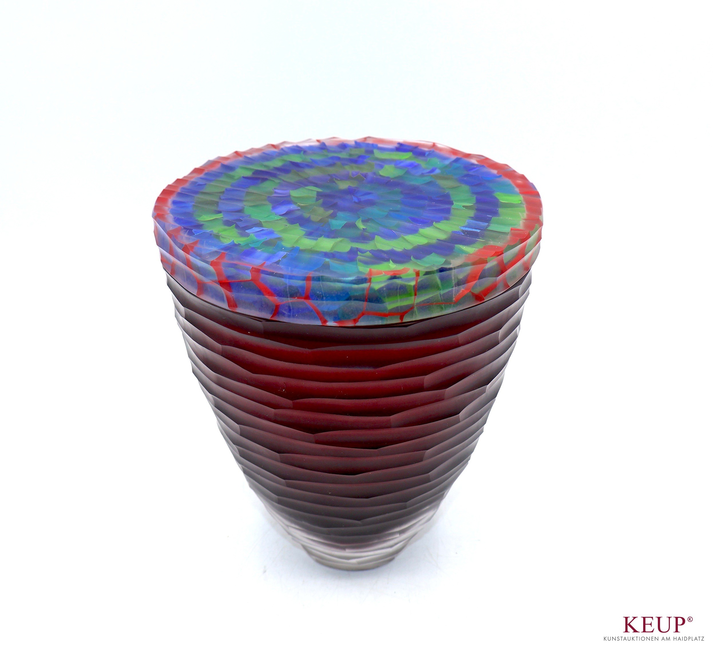 Glasobjekt - Gabriele KÜSTNER (1958 Göttingen) als Deckeldose, signiert, datiert 2005, Glas mit bunten Einschmelzungen, Höhe ca. 14,5 cm, Provenienz: Regensburg, vgl.Lit.: 1985-2002 Pilchuck Glass School in Stanwood (Washington); Von 1981 bis 1984 und von 1984 bis 1985 assistierte sie David Huchthausen an der Appalachian School of Crafts in Smithville (Tenessee); Besuch der Staatlichen Polytechnischen Hochschule für Glas in Hadamar; 1991-1992 war Kuestner zudem als Lehrassistentin an der Pilchuck Glass School tätig, Bayerischer Staatspreis für Kunsthandwerk (München; zweite Preis ''Glas 2000'' des Glasmuseums Immenhausen, Preis des Bundesverbands der Glasmacher (Hadamar), Niedersächsische Staatspreis für herausragende Leistungen (Hannover), Johann-Michael-Maucher-Preis (Schwäbisch Gmünd)