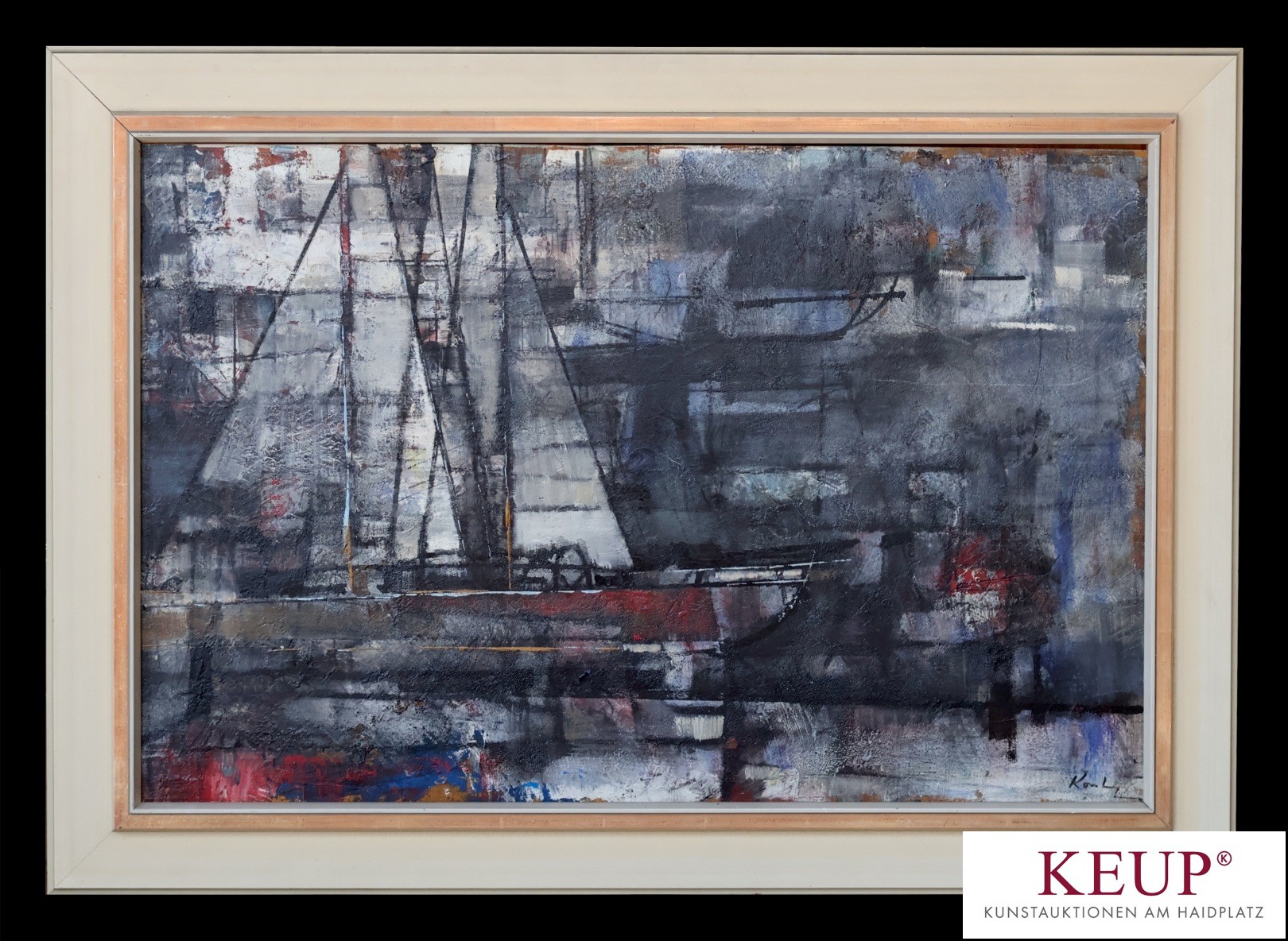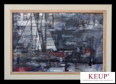 Gemälde - abstrakter anonymer Künstler (XX.Jahrhundert) ''Segelboot'', r.u. undeutlich signiert, Öl auf Malerpappe, Maße Darstellung ca. 60x90 cm, Rahmen